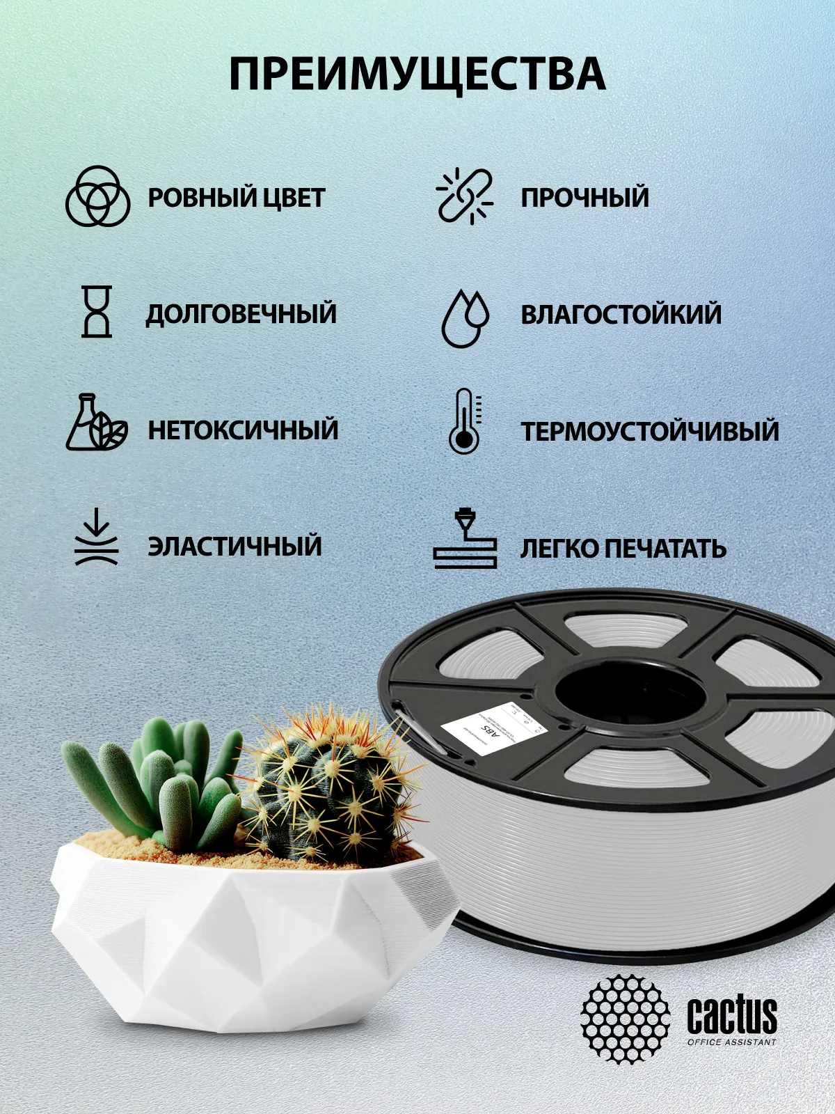 Пластик Cactus CS-3D-ABS-1KG-ABS — высококачественный ABS-пластик для 3D-печати. Он обеспечивает гладкую и равномерную печать, а также высокую детализацию и точность воспроизведения объектов. Некоторые преимущества: высокая прочность и ударостойкость; хорошая термостойкость; лёгкость в обработке и шлифовке; широкая совместимость с большинством 3D-принтеров.