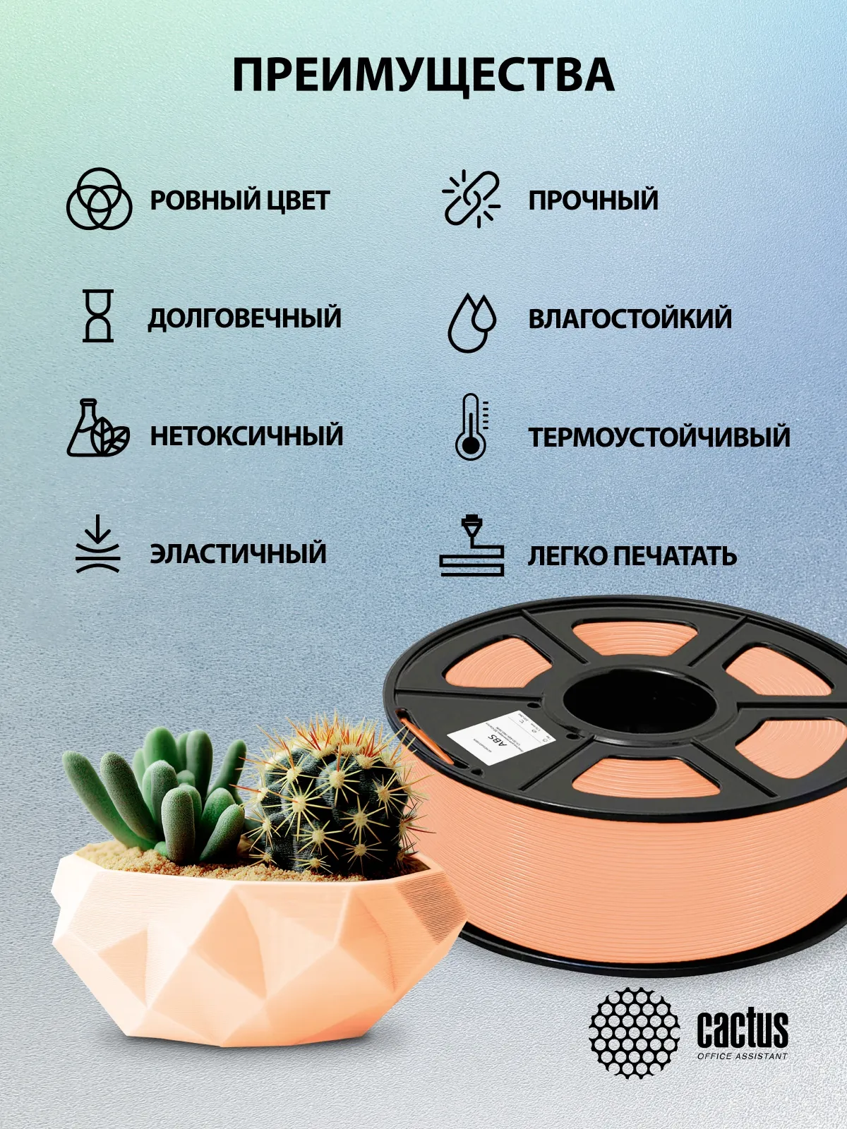 Пластик Cactus CS-3D-ABS-1KG-ABS — высококачественный ABS-пластик для 3D-печати. Он обеспечивает гладкую и равномерную печать, а также высокую детализацию и точность воспроизведения объектов. Некоторые преимущества: высокая прочность и ударостойкость; хорошая термостойкость; лёгкость в обработке и шлифовке; широкая совместимость с большинством 3D-принтеров.