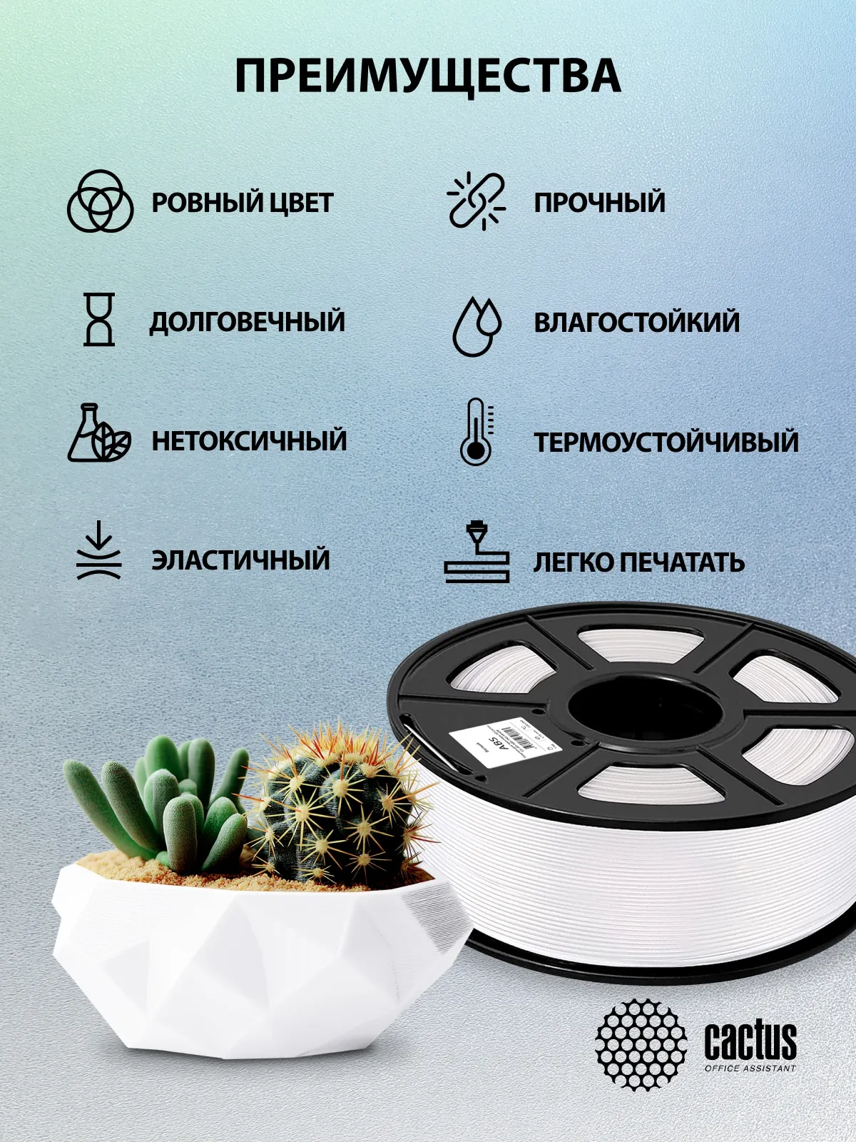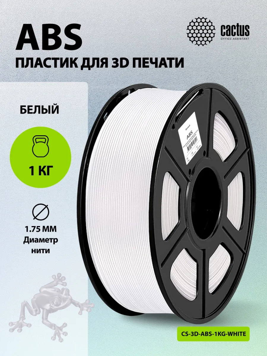 Пластик для принтера 3D Cactus CS-3D-ABS-1KG-WHITE ABS. Диаметр пластика: 1.75 мм. Вес пластика: 1 кг. Длина ~ 380м. Посадочный размер катушки– 56мм. Диаметр катушки – 200мм. Температура плавления – 220-260°С.