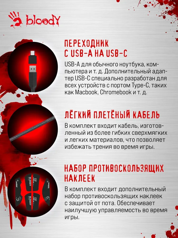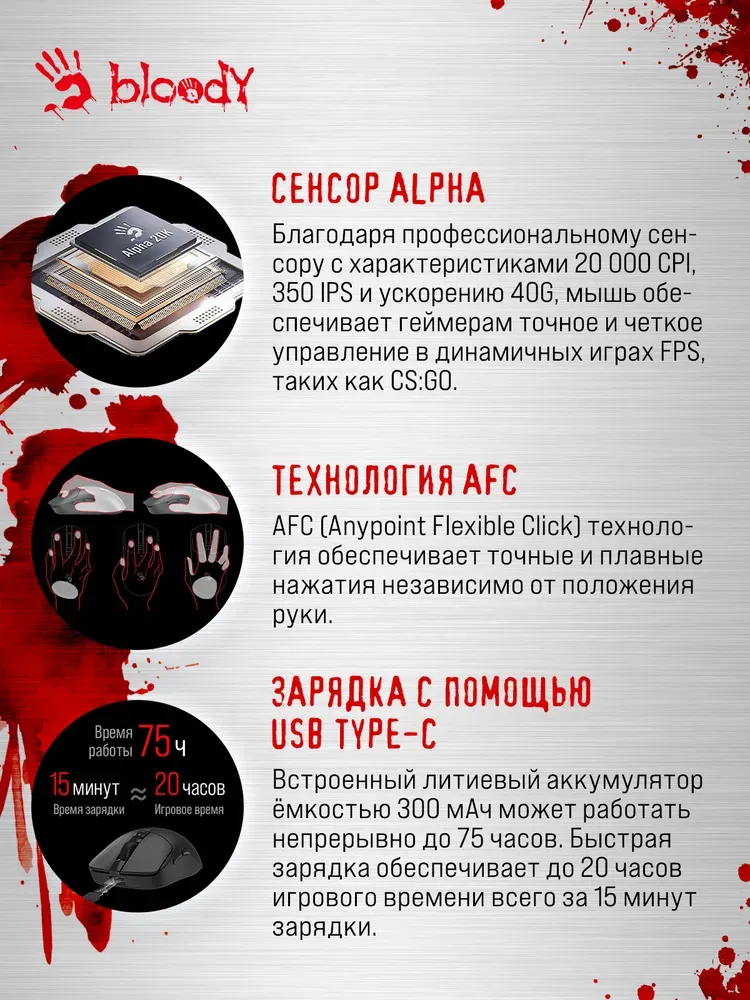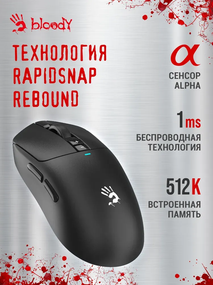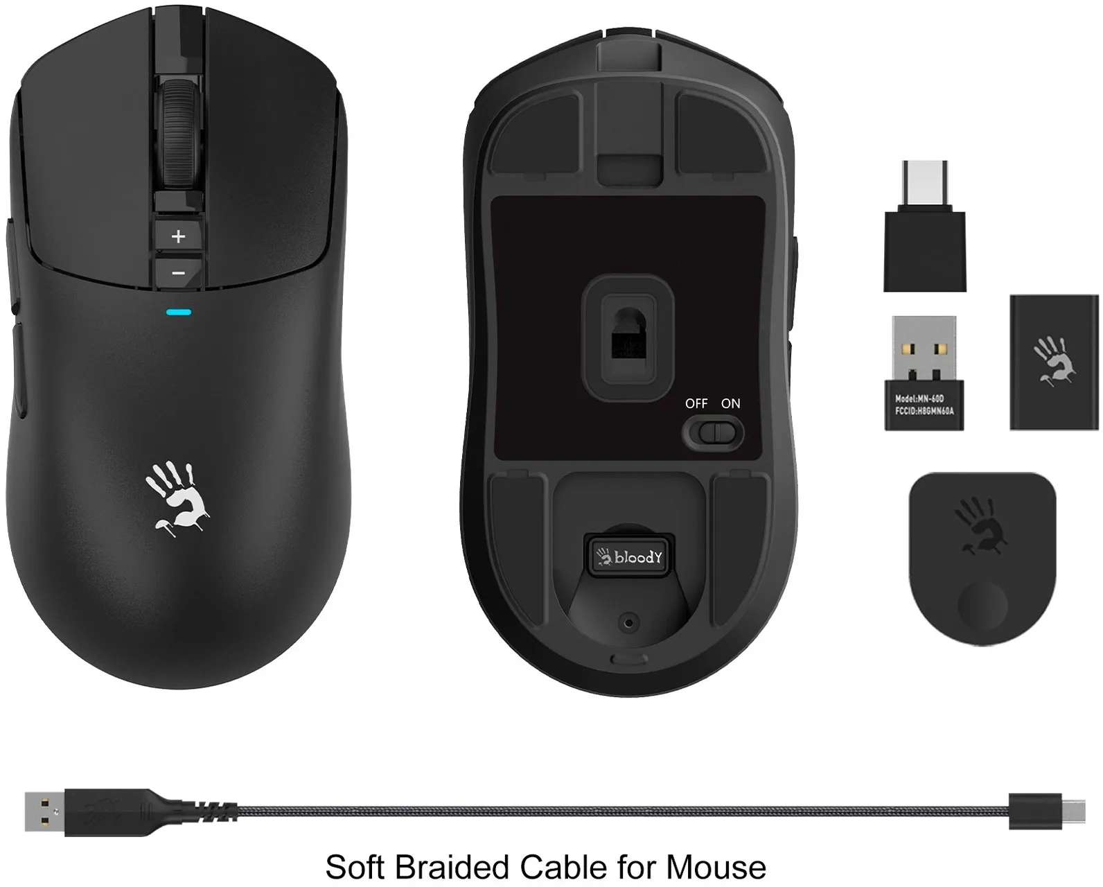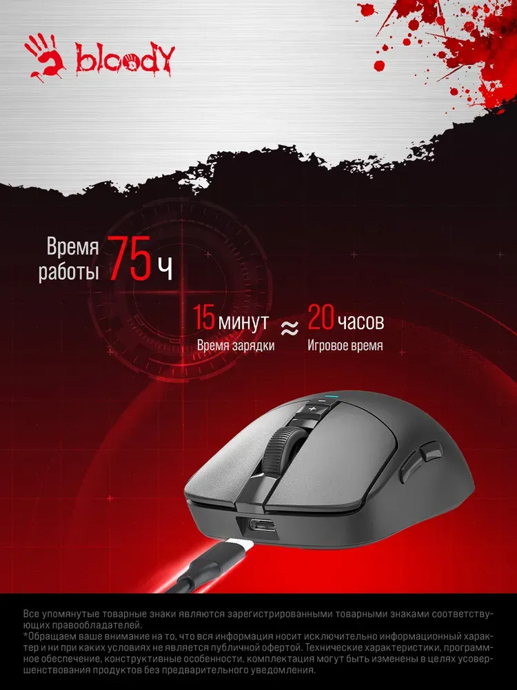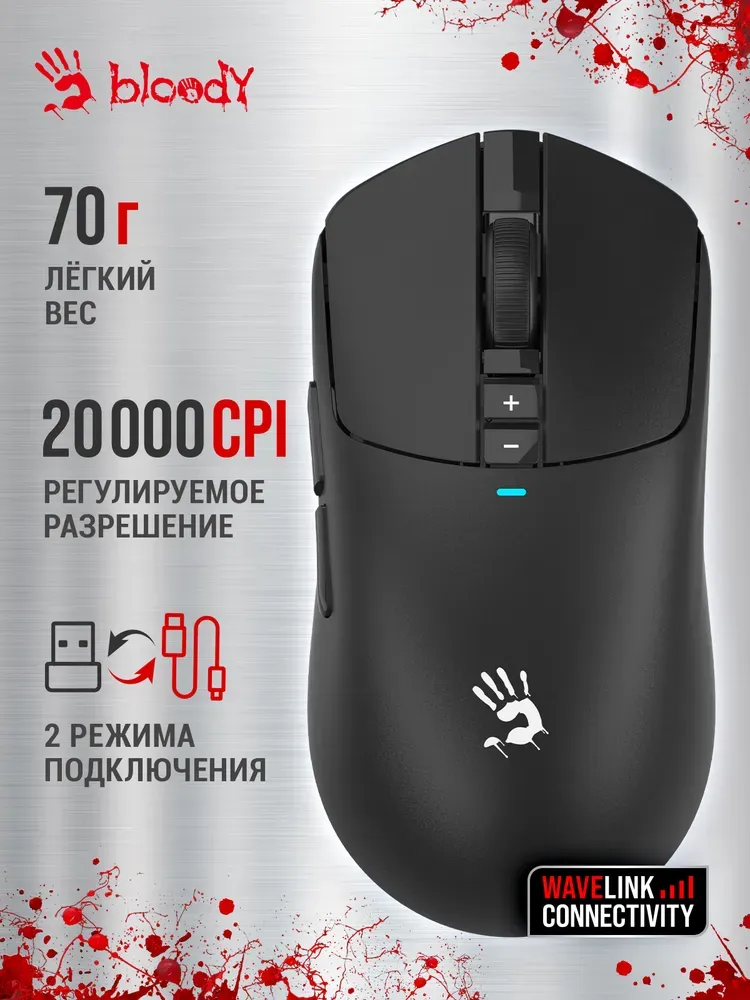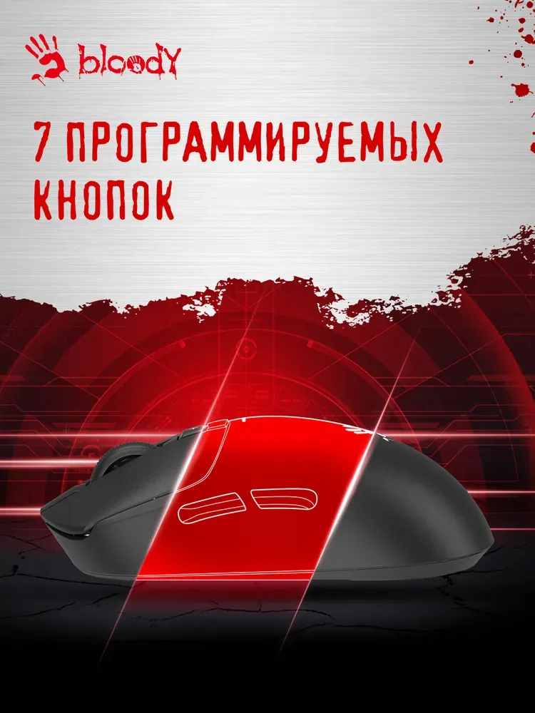 Мышь A4Tech Bloody R72 Ultra с разрешением сенсора 20000dpi и интерфейсом подключения USB-C 7but — беспроводная игровая мышь.
