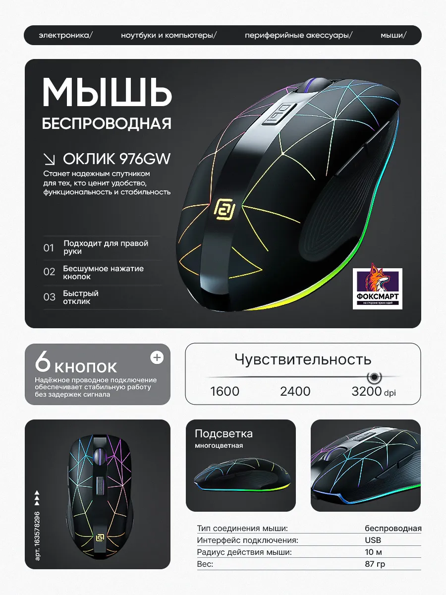 Беспроводная игровая мышь Oklick 976GW выделяется красивой 7-цветной подсветкой в виде тонкий линий по всему корпусу. На манипуляторе расположено 6 функциональных кнопок. Их ресурс – до 5 млн нажатий. Разрешение оптического сенсора можно настраивать, имеется несколько режимов: 800, 1200, 1600, 2400 и 3200 dpi. Модель комфортно использовать для игр любых жанров – от стратегий с элементами RPG до онлайн-шутеров, где важна скорость реакции. Девайс имеет эргономичную форму для правой руки. Тефлоновые ножки обеспечивают плавное скольжение практически на любой поверхности. Приятное на ощупь покрытие soft touch и прорезиненное колесо прокрутки делают управление мышью более комфортным и точным.
