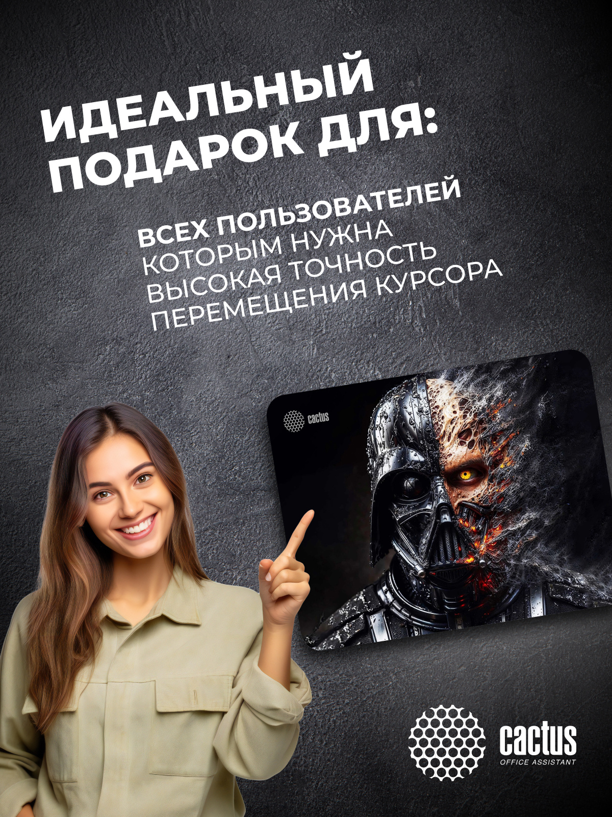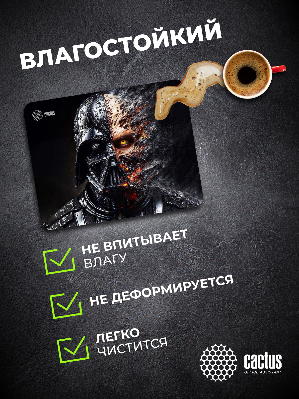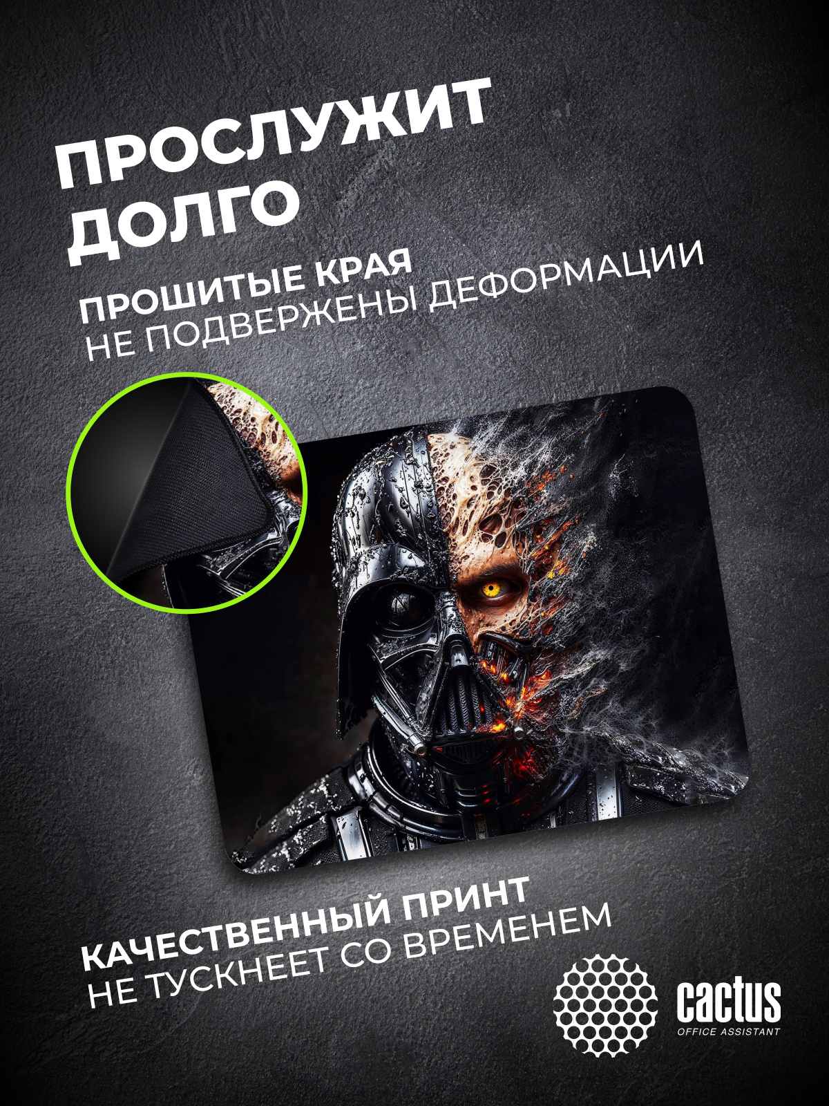 Коврик для мыши CS-MP-PRO22XL Darth Vader 400x300x3мм идеально подойдёт фанатам логических головоломок, квестов и стратегий. Он также будет полезен и пользователям офисных программ и графических редакторов, помогая более полно взаимодействовать с компьютерной мышью и точно позиционировать курсор. Лицевая сторона коврика обработана специальной тканью, которая очень комфортна на ощупь и гарантирует плавность и высокую точность передвижений курсора. Она обладает высокой прочностью и износостойкостью. Материал легко выдерживает постоянные движения мышью, поэтому он надолго сохранит привлекательный внешний вид. Край коврика защищён от истирания прочной гладкой прострочкой (оверлоком), которая не натирает кожу. Нижняя часть коврика, благодаря прорезиненному основанию, обеспечивает надежное сцепление с поверхностью стола. Поэтому, даже если пользователь будет совершать интенсивные движения мышкой, это не приведет к случайному сдвиганию коврика.