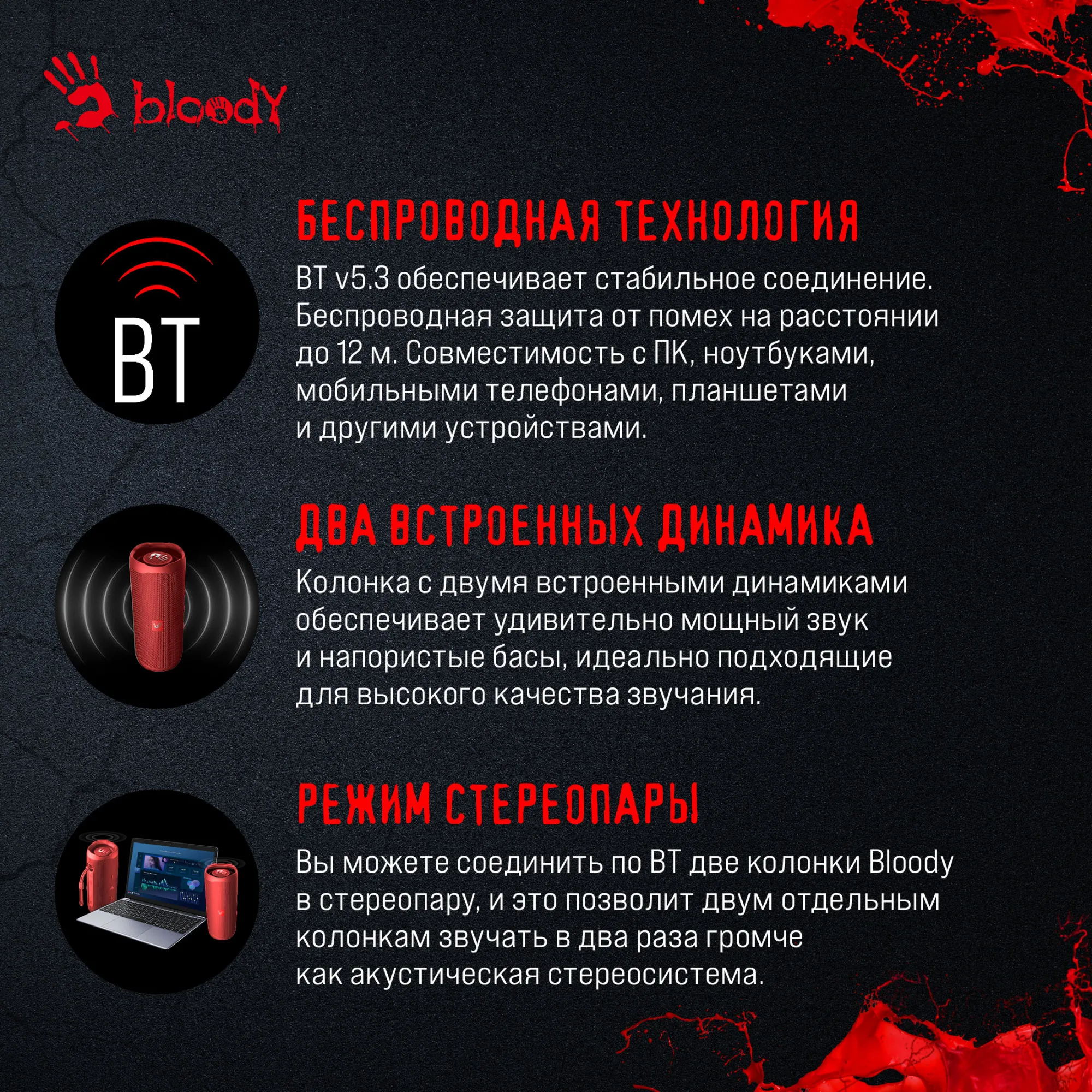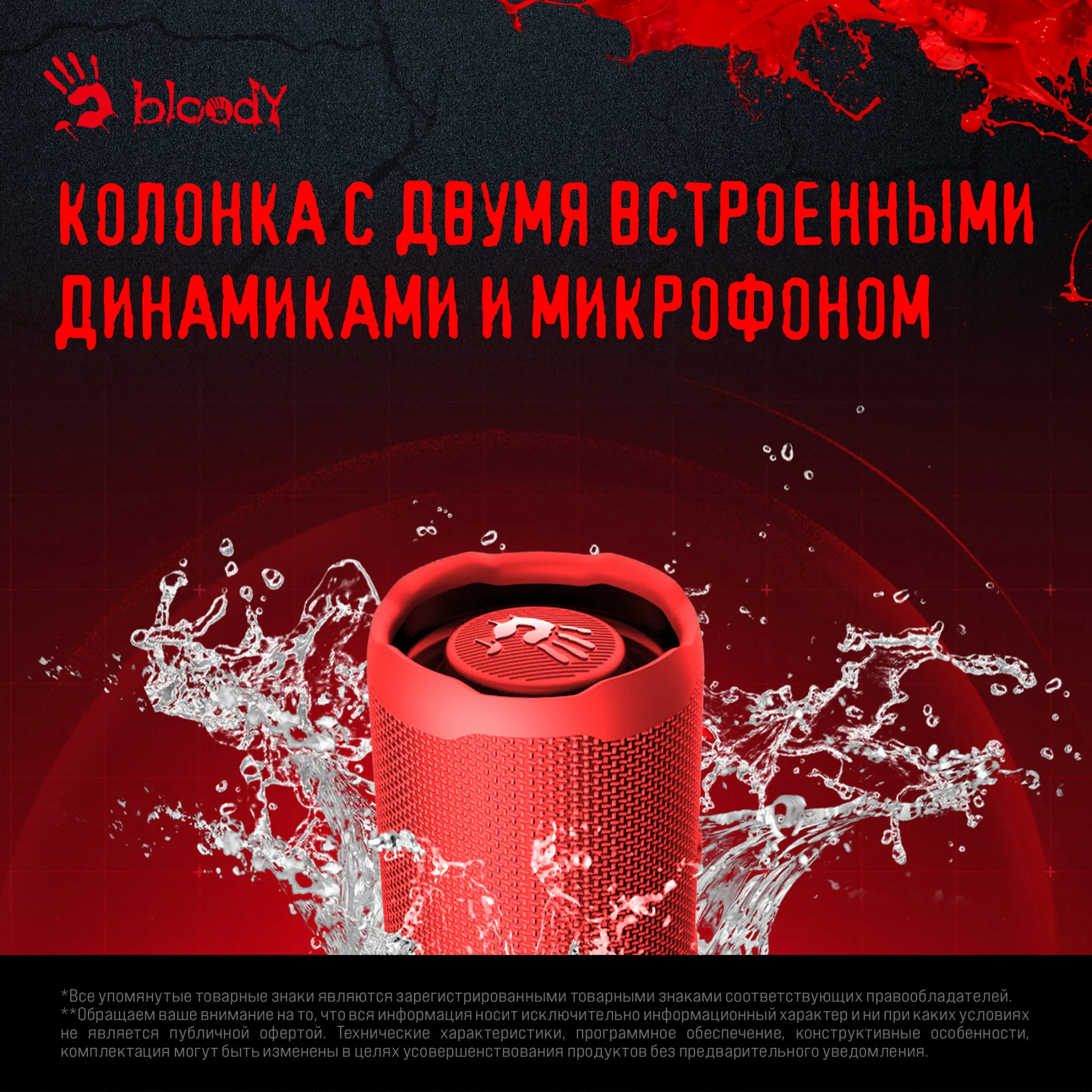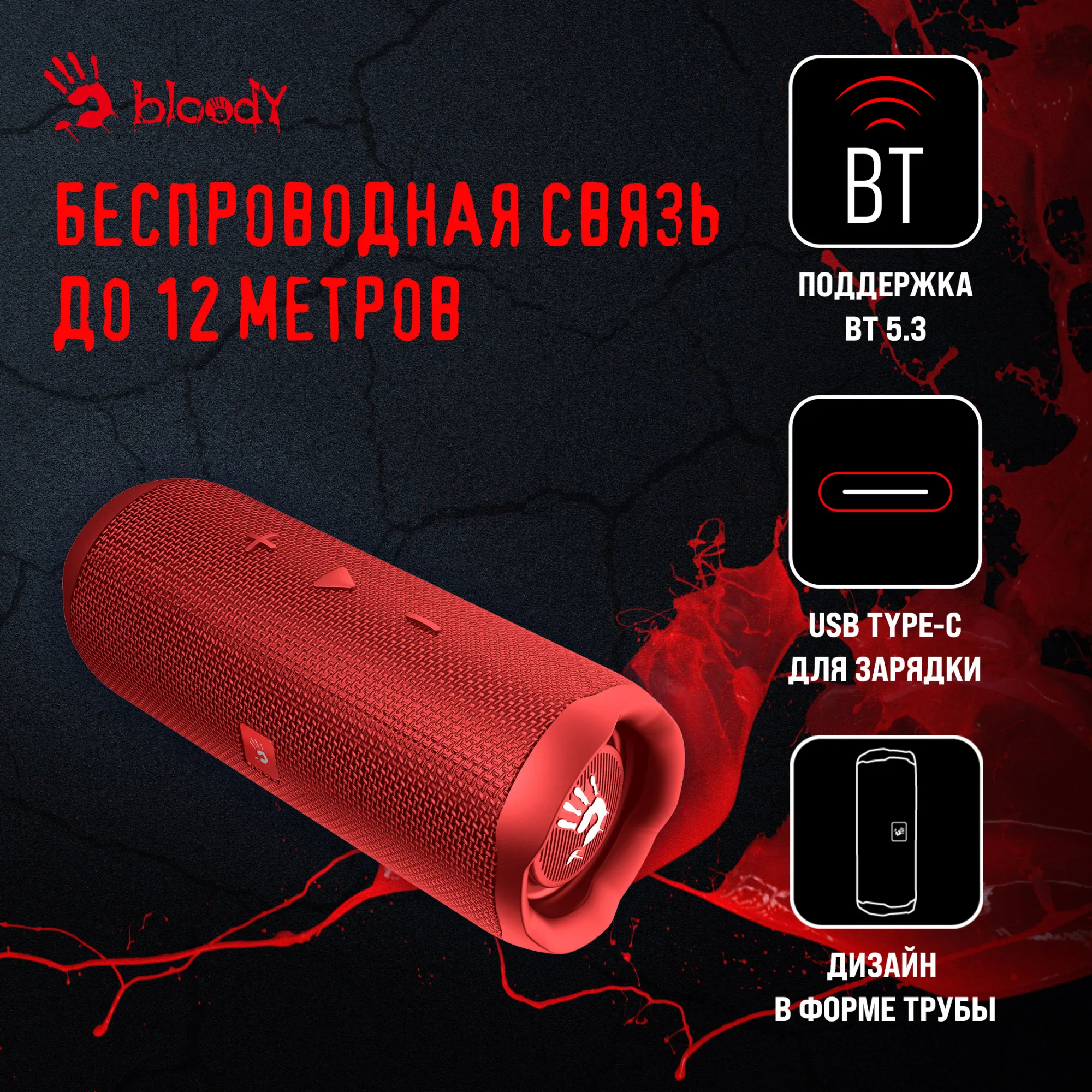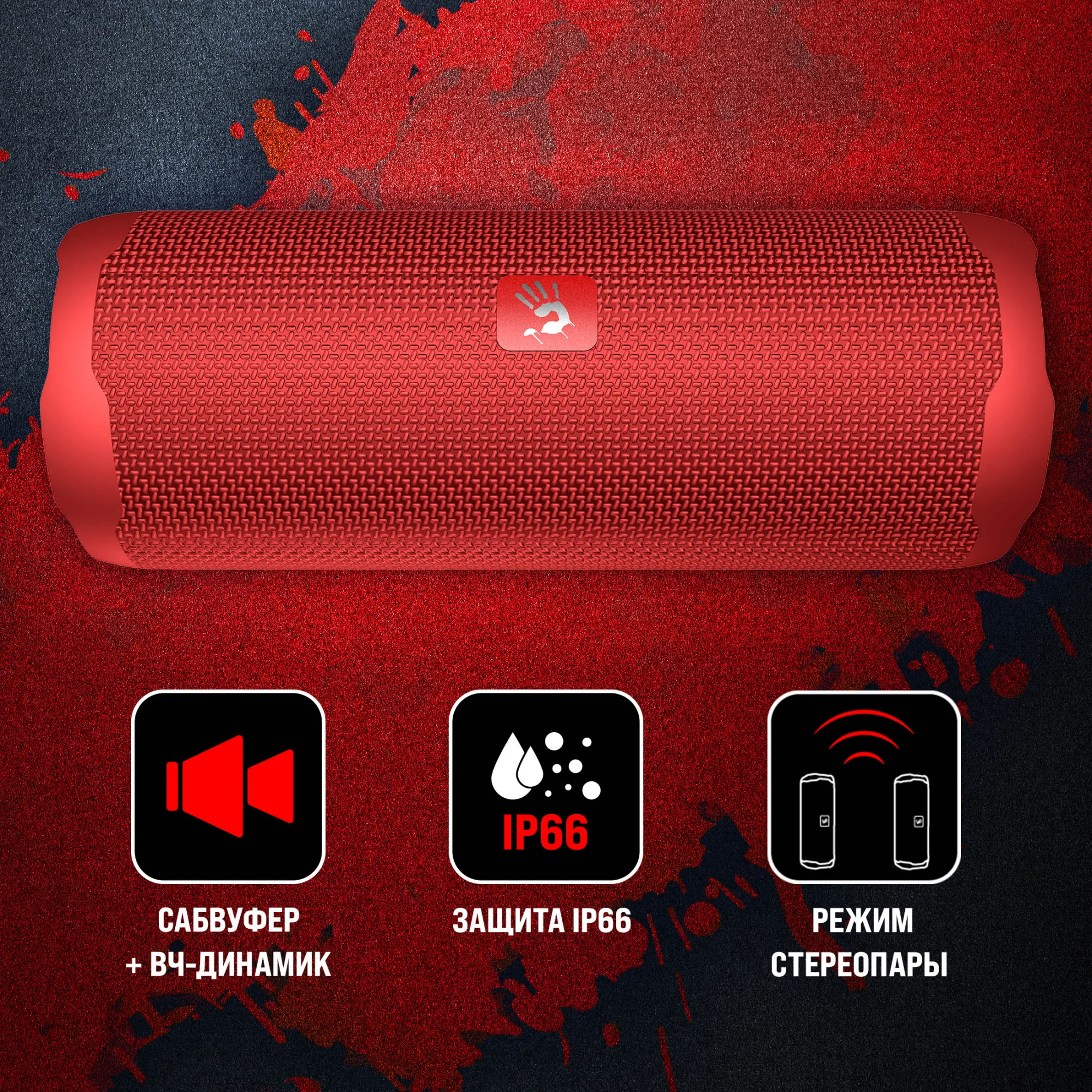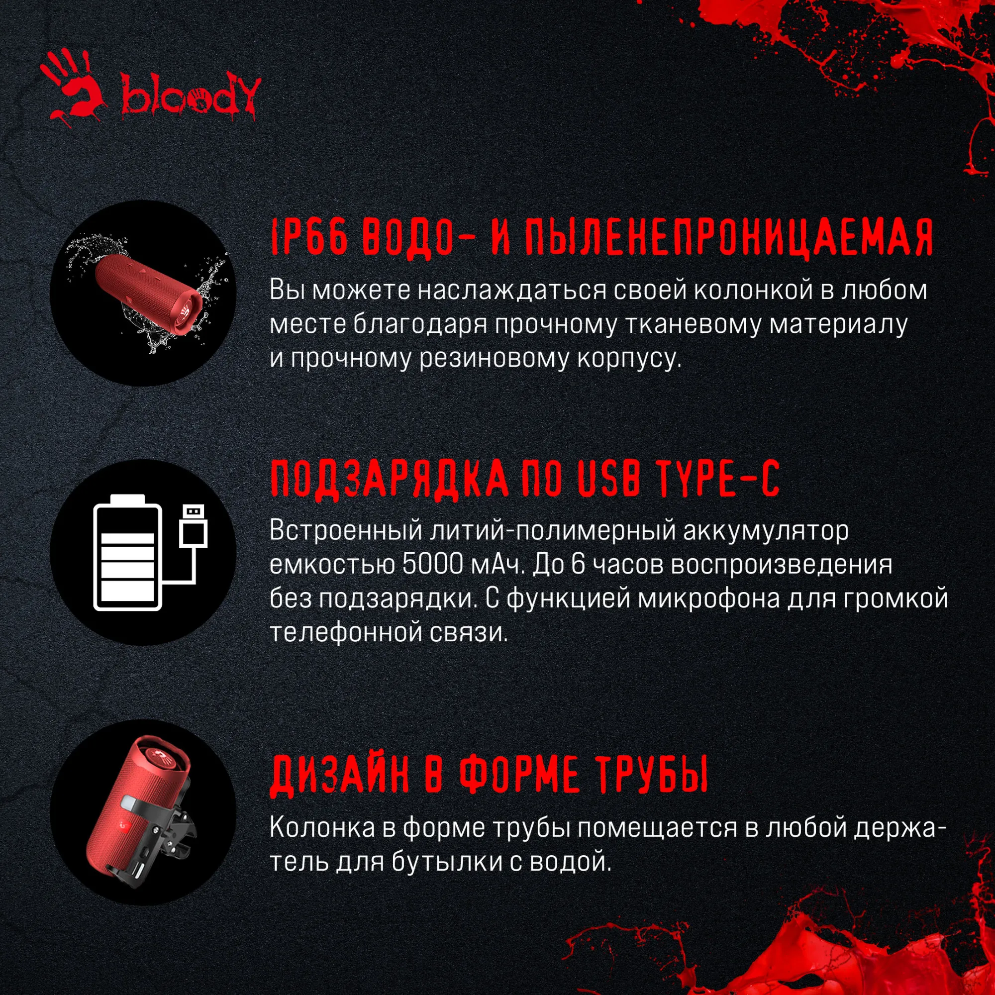 Колонка портативная Bloody S6 Tube Red с двумя встроенными динамиками обеспечивает удивительно мощный звук и напористые басы, идеально подходящие для высокого качества звучания. Bluetooth v5.3 обеспечивает стабильное соединение. Беспроводная защита от помех на расстоянии до 12 м. Совместимость с ПК, ноутбуками, мобильными телефонами, планшетами и другими устройствами. Вы можете соединить по Bluetooth две колонки Bloody в стереопару, и это позволит двум отдельным колонкам звучать в два раза громче как акустическая стереосистема. IP66 водо- и пыленепроницаемая: вы можете наслаждаться своей колонкой в любом месте благодаря прочному тканевому материалу и прочному резиновому корпусу. Встроенный литий-полимерный аккумулятор емкостью 5000 мАч. До 6 часов воспроизведения без подзарядки. С функцией микрофона для громкой телефонной связи. Колонка в форме трубы помещается в любой держатель для бутылки с водой.
