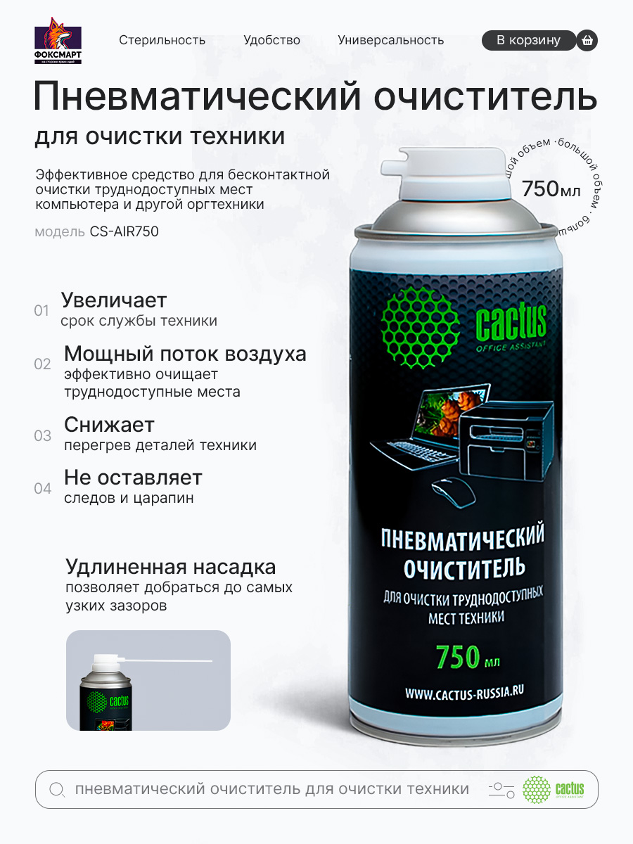Очиститель высокого давления позволяет очистить от пыли клавиатуру, мышь, оптические приборы, экраны мониторов, труднодоступные места оргтехники. Состав: бутан, пропан. Полная вместимость баллона: 1000 мл. Полезный (номинальный) объем баллона: 750 мл.