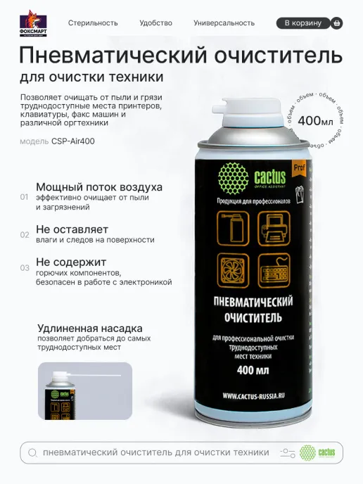 Очиститель высокого давления позволяет очищать от пыли и грязи труднодоступные места принтеров, компьютерной клавиатуры, копировальных машин, факс машин и различной оргтехники. Мощный напор струи обеспечивает быстроту и эффективность использования. Воздух в баллонах негорючий. Полезный (номинальный) объем баллона: 400 мл.