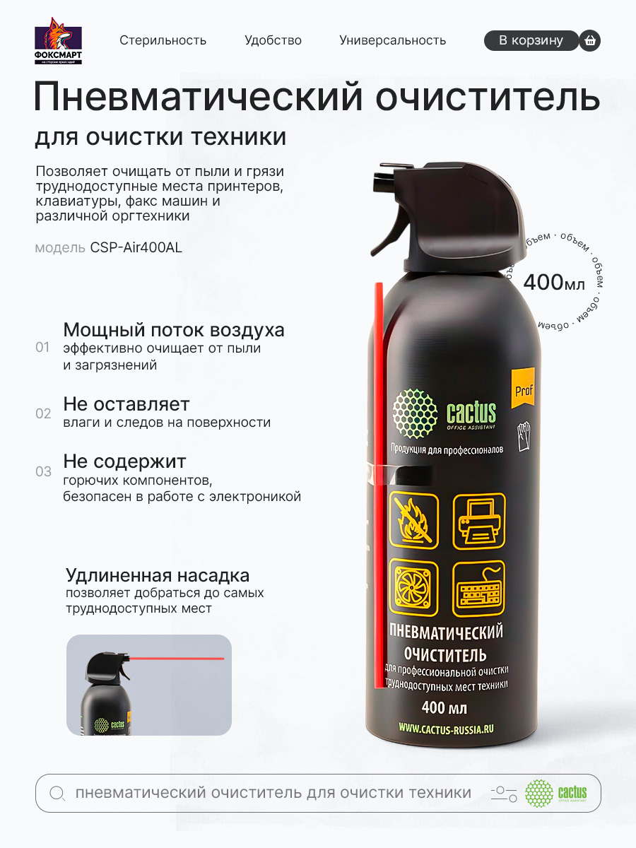 Очиститель высокого давления CSP-AIR400AL позволяет очищать от пыли и грязи труднодоступные места принтеров, компьютерной клавиатуры, копировальных машин, факс машин и различной оргтехники. Мощный напор струи обеспечивает быстроту и эффективность использования. Воздух в баллонах негорючий.