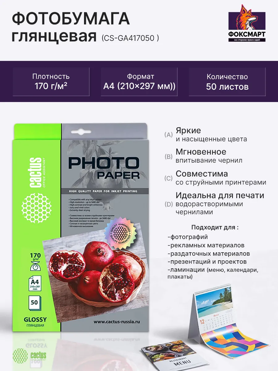 Глянцевая фотобумага Cactus представляет собой оптимальное сочетание цены и качества. Она отлично подходит для печати памятных фотографий в фото-рамку или фотоальбом. Обладая приятным глянцевым блеском, она украсит ваши фотографии и презентации. А высококлассное покрытие позволит добиться максимально точной цветопередачи, что будет полезно при печати макетов и web-графики. Покрытие первой стороны: глянцевое.