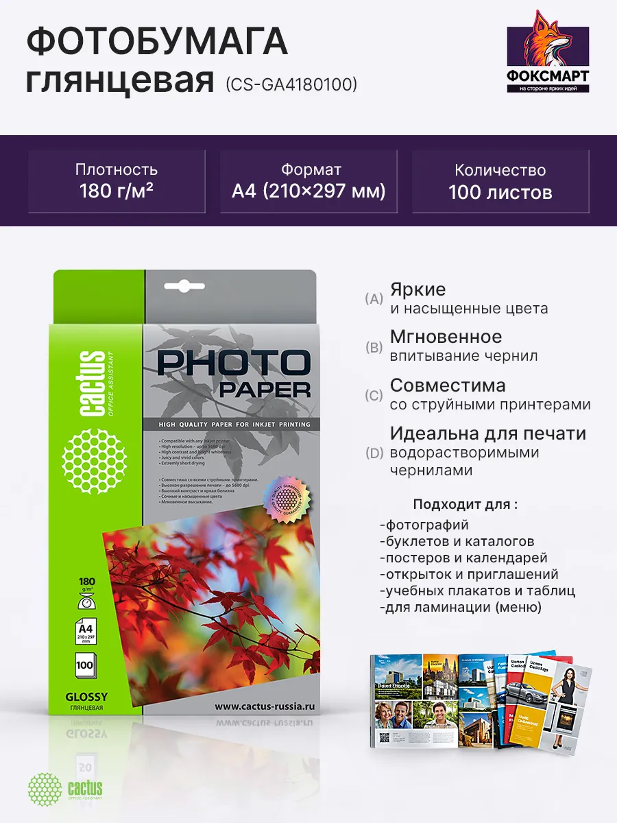Фотобумага CS-GA4180100 - идеальный выбор для тех, кто увлекается фотопечатью. Она идеально подходит для создания ярких и качественных фотографий, которые будут радовать глаз. Благодаря своему высокому качеству и плотности, фотобумага CS-GA4180100 обеспечивает четкую и насыщенную цветопередачу, позволяя сохранить все детали и оттенки. Эта фотобумага совместима с различными моделями принтеров, что делает ее универсальным решением для домашних и профессиональных фотографов. Она также легко поддается обработке, благодаря чему вы сможете быстро и без проблем создавать свои уникальные проекты. Фотобумага CS-GA4180100 доступна в формате А4, что позволяет использовать ее для печати различных типов фотографий, включая портретные, пейзажные и другие. Она также подходит для печати на струйных и лазерных принтерах, обеспечивая высокое качество печати на любом устройстве. Приобретая фотобумагу CS-GA4180100, вы получаете возможность создавать яркие и насыщенные фотографии, которые станут украшением вашего дома или офиса.