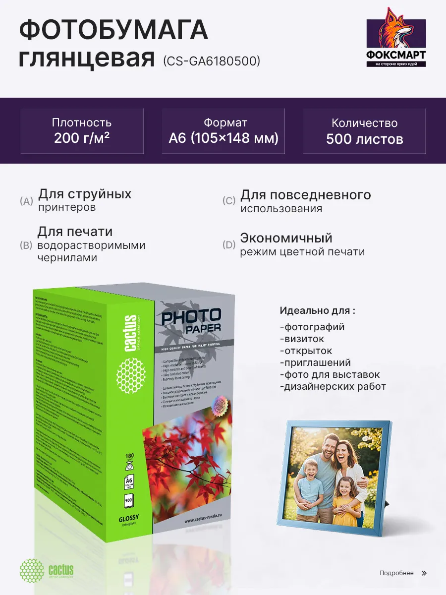 Глянцевая фотобумага Cactus серии Standard для струйной печати обладает покрытием с хорошей фиксацией чернил, водонепроницаемостью, имеет гладкую блестящую поверхность, поэтому наилучшим образом передает яркие, насыщенные цвета с множеством оттенков и цветовых градаций. На глянцевой бумаге рекомендуется печатать водорастворимыми чернилами. Поры покрытия мелкие и не пропускают частицы некоторых видов пигментных чернил, поэтому пигментные чернила могут немного смазываться. Водорастворимые чернила быстро впитываются и закрепляются, создавая яркое и насыщенное изображение. Плотность: 180 г/м2. Количество листов в пачке: 500.