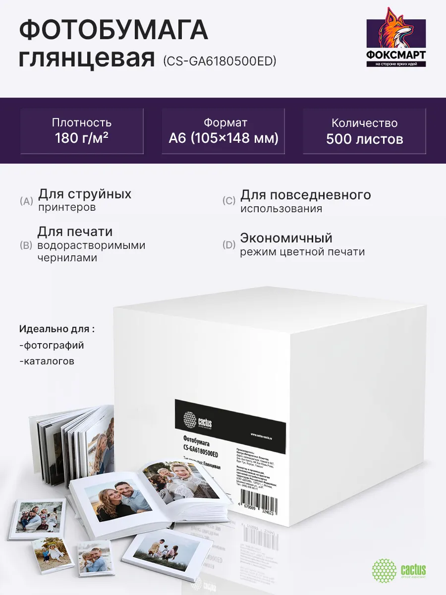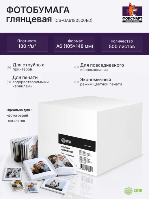 Глянцевая фотобумага Cactus серии Every Day для струйной печати. Идеально подойдет для повседневного использования и экономичного режима цветной печати. На глянцевой бумаге рекомендуется печатать водорастворимыми чернилами. Поры покрытия мелкие и не пропускают частицы некоторых видов пигментных чернил, поэтому пигментные чернила могут немного смазываться. Водорастворимые чернила быстро впитываются и закрепляются, создавая яркое и насыщенное изображение.