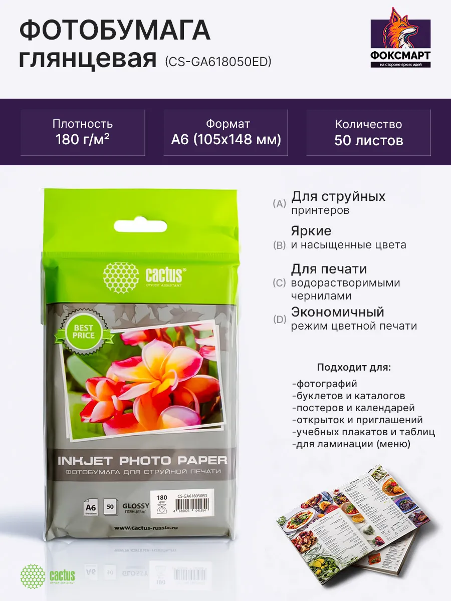 Глянцевая фотобумага Cactus серии Every Day для струйной печати. Идеально подойдет для повседневного использования и экономичного режима цветной печати. На глянцевой бумаге рекомендуется печатать водорастворимыми чернилами. Поры покрытия мелкие и не пропускают частицы некоторых видов пигментных чернил, поэтому пигментные чернила могут немного смазываться. Водорастворимые чернила быстро впитываются и закрепляются, создавая яркое и насыщенное изображение. Покрытие первой стороны: глянцевое.