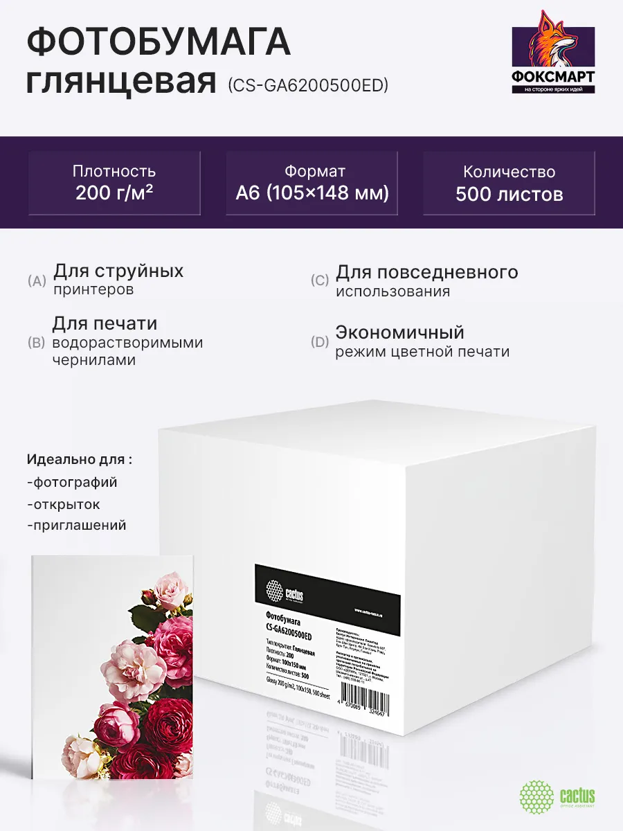 Фотобумага Cactus CS-GA6200500ED - это высококачественный материал для печати, предназначенный для использования с струйными принтерами. Она изготовлена из плотной, гладкой и белой бумаги, которая обеспечивает идеальную поверхность для четкой и яркой печати ваших фотографий, графики и других изображений. Благодаря специальным впитывающим свойствам фотобумаги, краска быстро высыхает, не растекается и не размазывается, обеспечивая профессиональное качество печати. Покрытие первой стороны: глянцевое. Плотность: 200 г/м2.