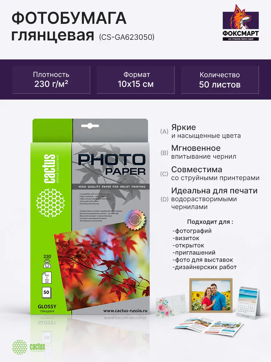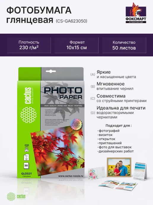 Глянцевая фотобумага Cactus серии Standard для струйной печати обладает покрытием с хорошей фиксацией чернил, водонепроницаемостью, имеет гладкую блестящую поверхность, поэтому наилучшим образом передает яркие, насыщенные цвета с множеством оттенков и цветовых градаций.