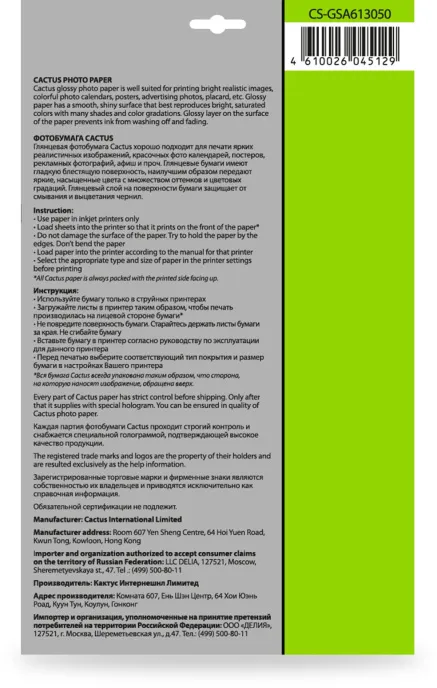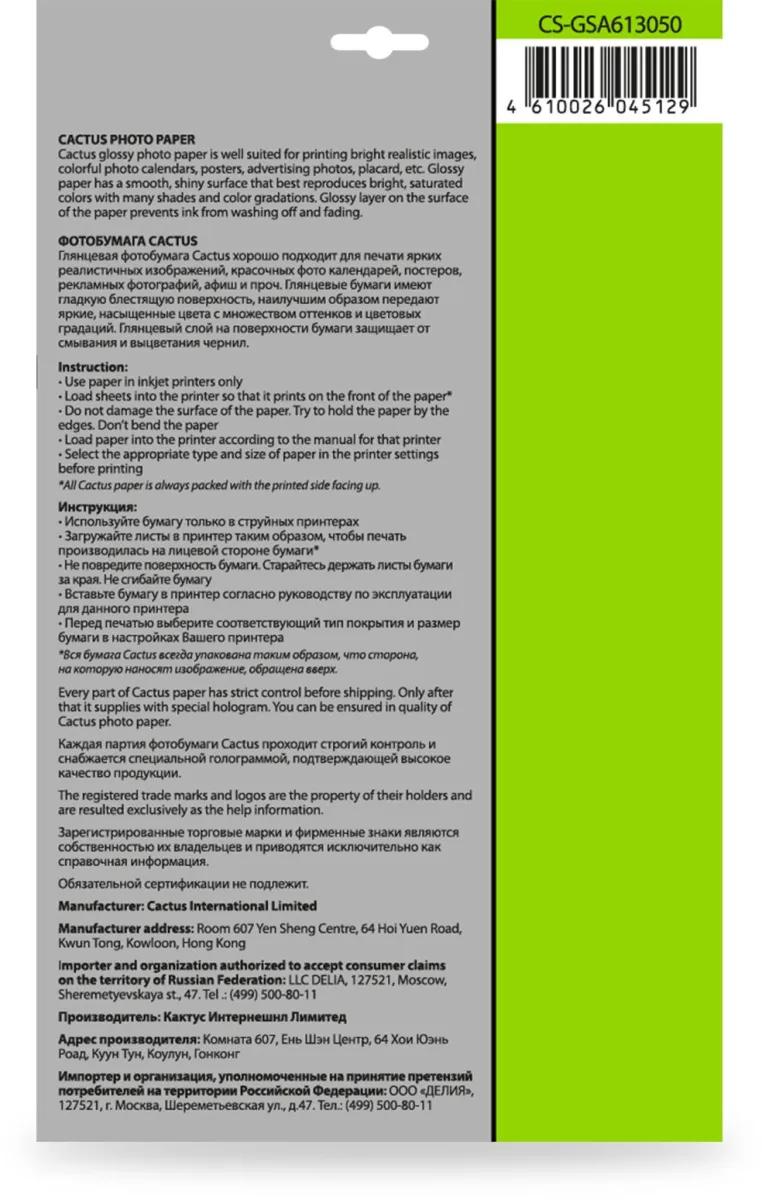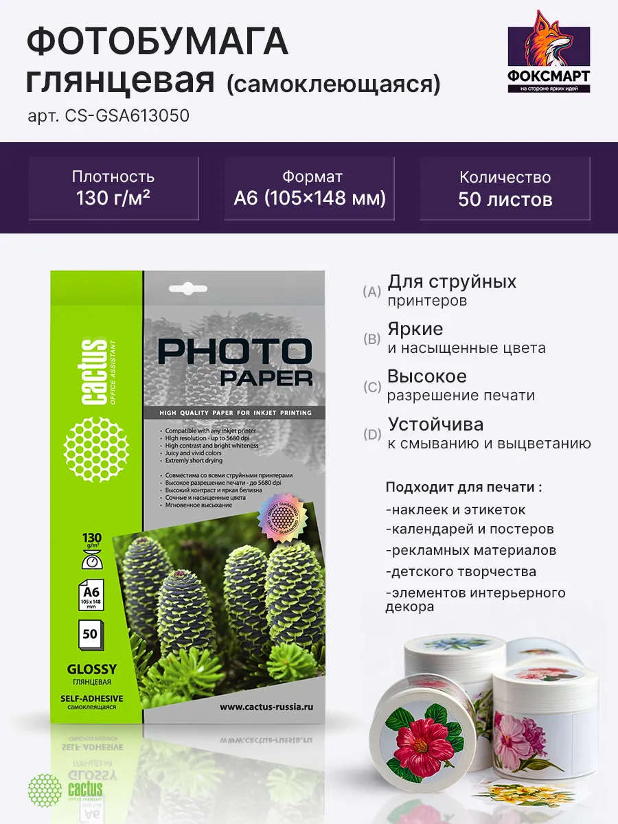 Глянцевая самоклеящаяся фотобумага Cactus серии Standard для струйной печати. Идеально подойдет для печати рекламных и информационных объявлений, элементов интерьерного декора, детского творчества, наклеек, этикеток и пр. Для нанесения на поверхности не требуется дополнительного клея или скотча, так как самоклеящаяся фотобумага имеет мощную клеевую основу обеспечивающую отличное сцепление с поверхностью. Глянцевая бумага обладает покрытием с хорошей фиксацией чернил, водонепроницаемостью, имеет гладкую блестящую поверхность, поэтому наилучшим образом передает яркие, насыщенные цвета с множеством оттенков и цветовых градаций. На глянцевой бумаге рекомендуется печатать водорастворимыми чернилами. Поры покрытия мелкие и не пропускают частицы некоторых видов пигментных чернил, поэтому пигментные чернила могут немного смазываться. Водорастворимые чернила быстро впитываются и закрепляются, создавая яркое и насыщенное изображение.