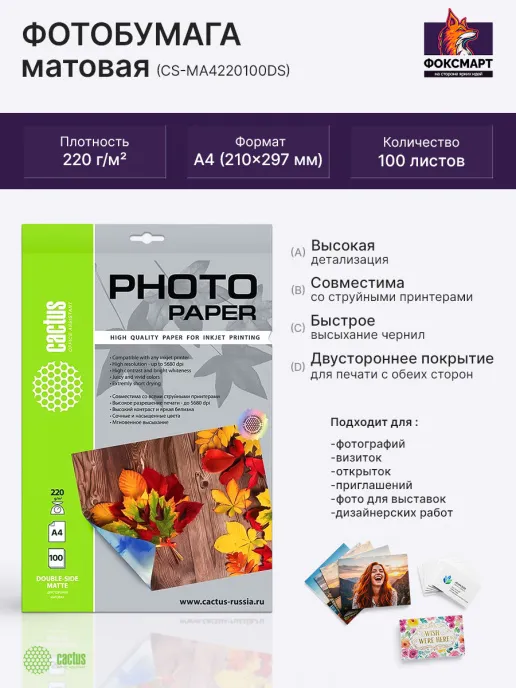 CS-MA4220100DS - высококачественная двусторонняя матовая фотобумага формата A4, плотность 220г/м². Предназначена для струйной печати, идеально подходит для создания четких и ярких изображений с хорошей цветопередачей (например, фотографий, художественных репродукций и дизайнерских проектов). В упаковке 100 двусторонних листов. Благодаря плотной текстуре бумага обеспечивает высокую долговечность и защиту от выцветания. Фотобумага CS-MA4220100DS совместима со многими моделями струйных принтеров.