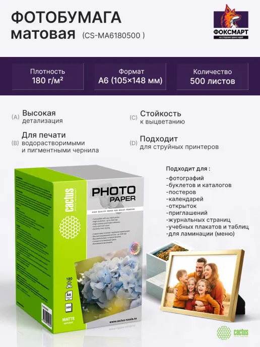 Фотобумага CS-MA6180500 подходит для струйной печати. Идеально подходит для печати фотографий, репродукций произведений искусства, дизайнерских проектов и других графических работ, требующих высокого качества и долговечности