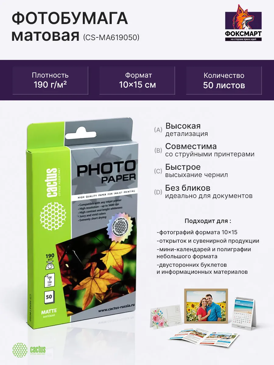 Матовая фотобумага CS-MA619050 - это отличный выбор для профессиональных фотографов и любителей, которые хотят получить высококачественные отпечатки с максимальной детализацией. Эта фотобумага имеет плотность 190 г/м2, что обеспечивает превосходное качество изображения и устойчивость к износу.