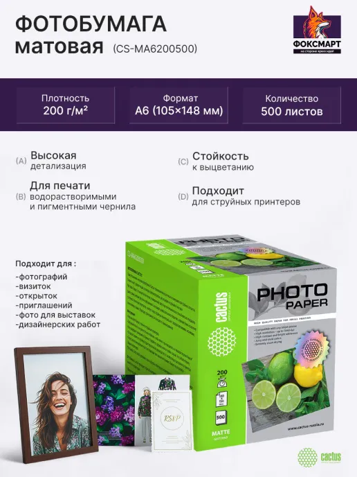 Фотобумага CS-MA6200500.Подходит для струйной печати, идеально подходит для печати фотографий, репродукций произведений искусства, дизайнерских проектов и других графических работ, требующих высокого качества и долговечности.