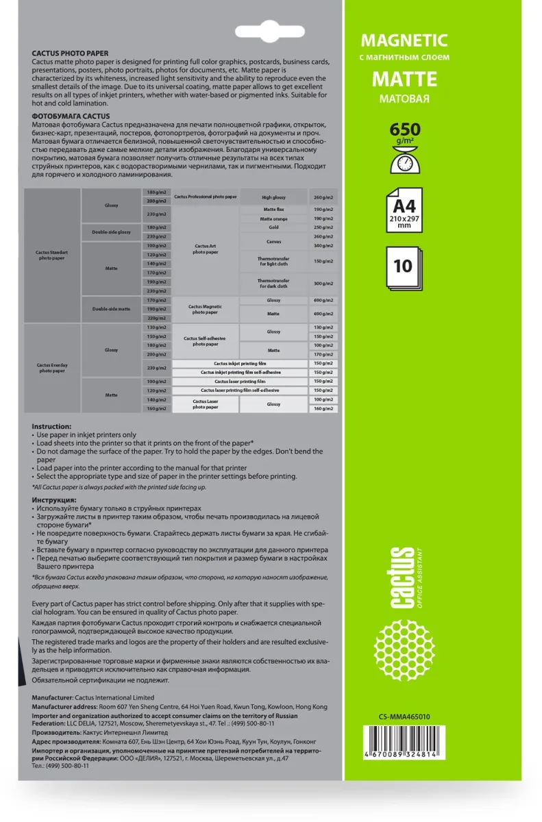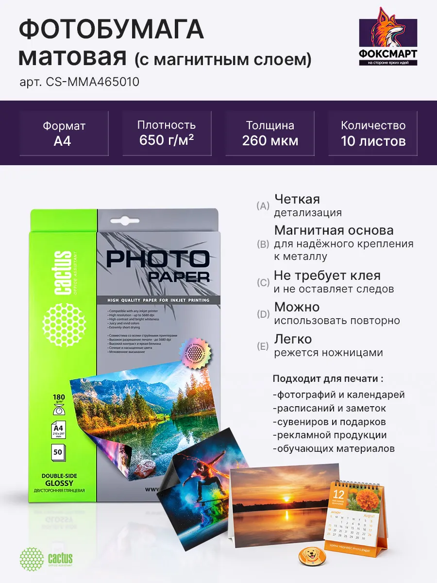 CS-MMA465010 — это высококачественная фотобумага для струйной печати с размером A4. Она идеально подходит для создания ярких и чётких фотографий. Фотобумага произведена из прочных и долговечных материалов. Она также устойчива к царапинам и влаге, благодаря чему ваши фотографии сохранят своё качество на долгие годы. CS-MMA465010 станет отличным выбором для всех, кто ценит высокое качество в фотопечати. Покрытие первой стороны-матовое. Покрытие второй стороны-магнитный слой. Подходит для струйной печати.
