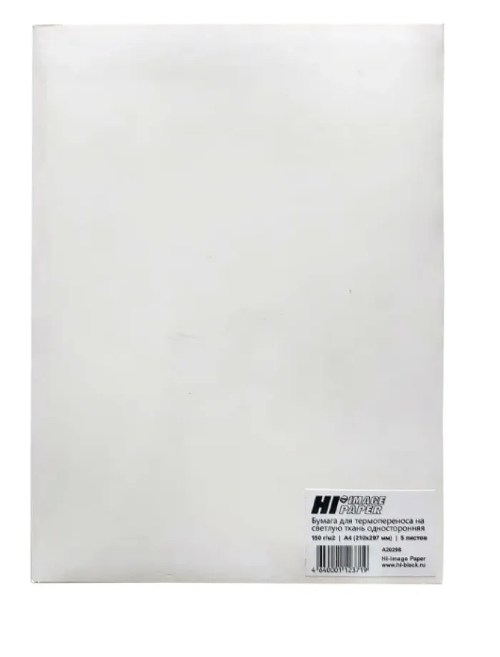 Бумага термотрансферная Hi-Image Paper предназначена для высококачественной печати на светлых тканях с помощью специальных термотрансферных принтеров. Она обеспечивает яркие, насыщенные цвета и точную передачу деталей, делая ваши текстильные изделия еще привлекательнее. Формат бумаги - A4, плотность составляет 150 г/м². Это идеальный выбор для создания уникальных футболок, толстовок, аксессуаров и других предметов одежды с индивидуальным дизайном. Благодаря высоким показателям плотности и прочности, термотрансферные изображения надежно фиксируются на ткани и сохраняют свою первоначальную яркость даже после многочисленных стирок и глажек. Особенности использования: Помещать бумагу в принтер по 1 листу. Печать осуществляется в зеркальном отображении. Полученное изображение должно хорошо просохнуть.