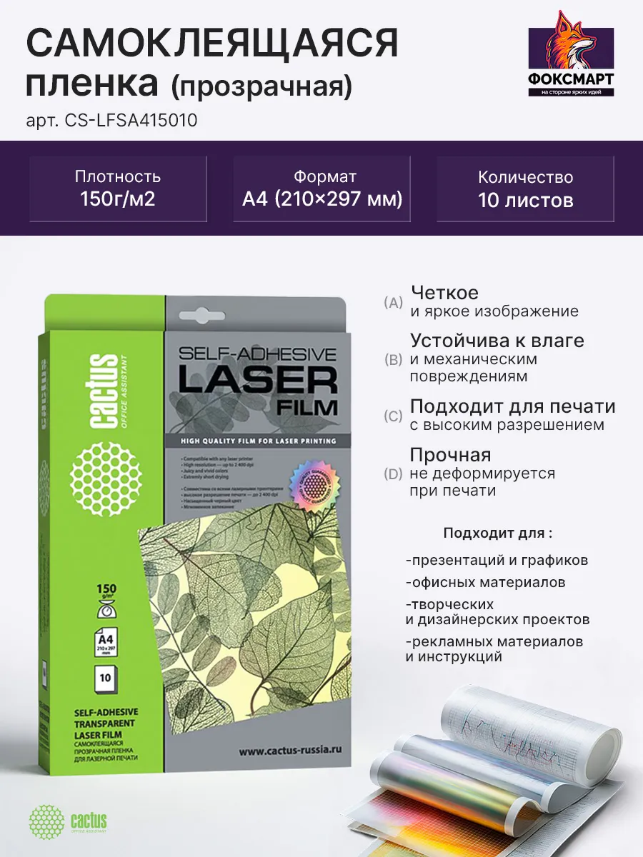 Пленка Cactus CS-LFSA415010 A4/150г/м2/10л./прозрачный самоклей. для лазерной печати.