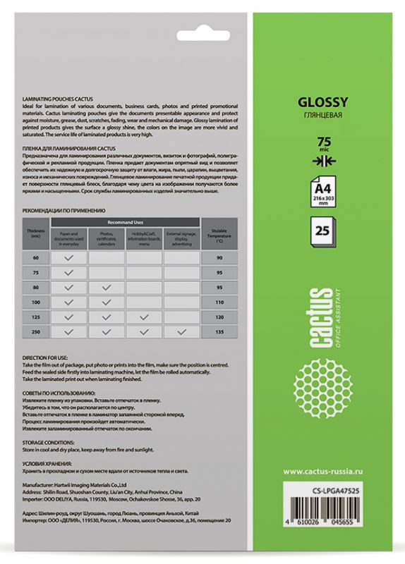 Пленка для ламинирования Cactus предназначена для ламинирования различных документов, визиток и фотографий, полиграфической и рекламной продукции. Пленка придает документам опрятный вид и позволяет обеспечить их надежную и долгосрочную защиту от влаги, жира, пыли, царапин, выцветания, износа и механических повреждений. Глянцевое ламинирование печатной продукции придает поверхности глянцевый блеск, благодаря чему цвета на изображении получаются более яркими и насыщенными. Срок службы ламинированных изделий значительно выше.