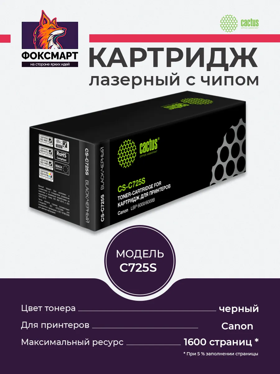 Картридж лазерный Cactus CS-С725S черный (1600стр.) - это высококачественный лазерный картридж, созданный специально для использования с принтерами Canon .Он обеспечивает высокую производительность и надежность печати, а также экономию времени и денег на обслуживание принтера. Картридж имеет емкость 1600 страниц, что позволяет использовать его длительное время без необходимости замены. Он изготовлен из высококачественных материалов, обеспечивающих долговечность и надежность работы.