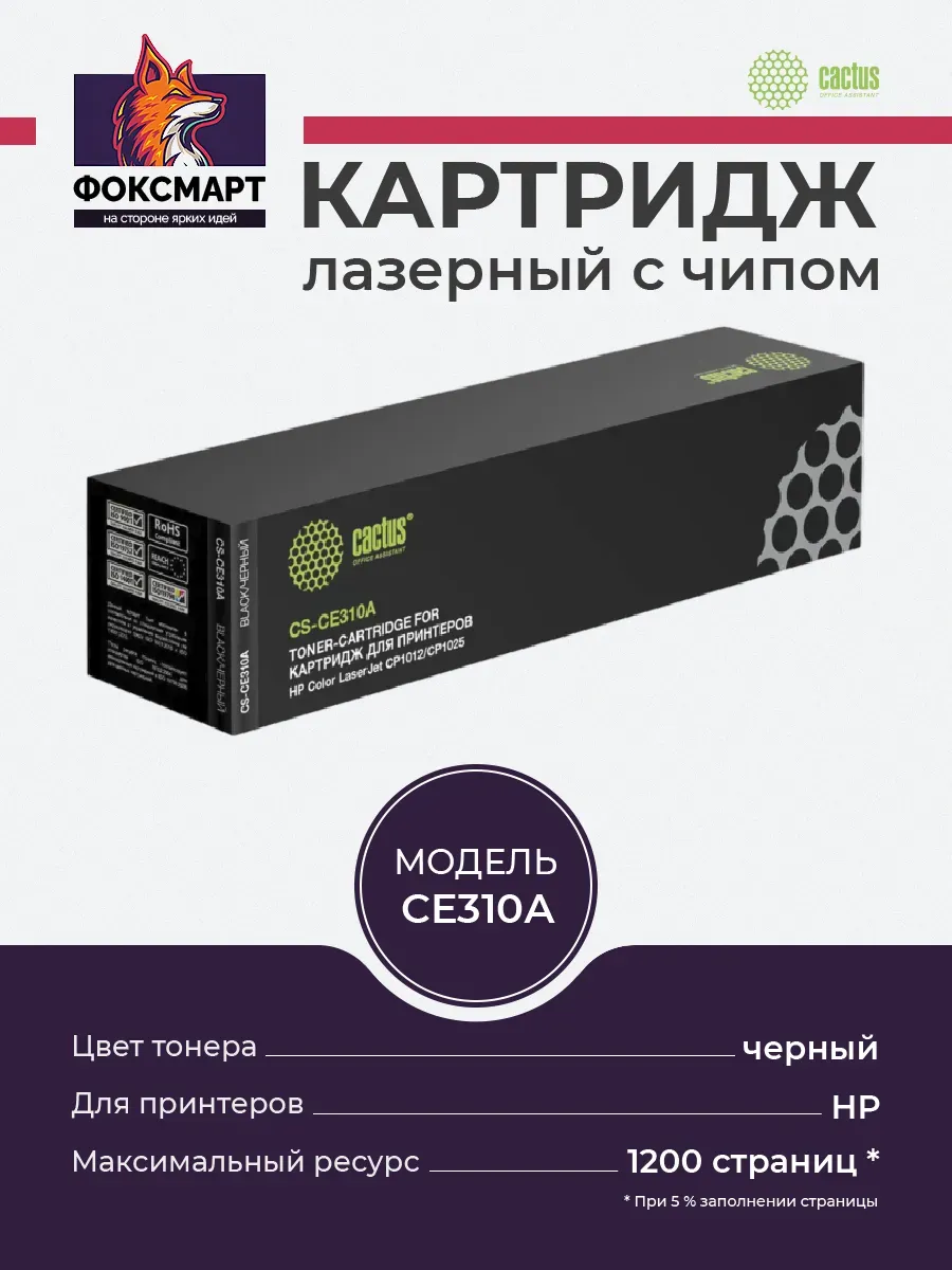 Лазерный картридж Cactus CS-CE310A (HP 126A) предназначен для использования в принтерах HP Color LaserJet CP1012 Pro, CP1025 Pro (CF346A), CP1025nw Pro (CE918A), CP1025 Pro Plus, M175a color MFP Pro (CE865A), M175nw (CE866A), M275 (CF040A), M275nw (200 color MFP). Используя картридж Cactus CS-CE310A у Вас будет возможность распечатать около 1200 информационных страниц (при 5% заполнении). Совместимый лазерный картридж Cactus CS-CE310A предоставит Вам чёткие и насыщенные напечатанные документы.