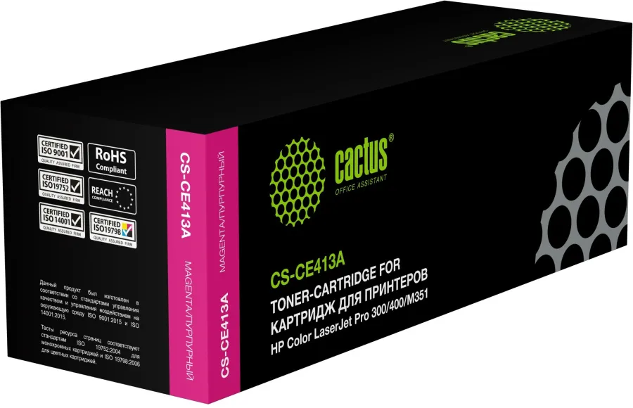 Картридж CACTUS CS-CE413A - это надежный и экономичный выбор для печати высококачественных документов. Этот совместимый картридж с пурпурным тонером обеспечивает четкие и яркие отпечатки, идеально подходящие для печати презентаций, отчетов и других важных материалов. Максимальный ресурс картриджа составляет 2600 страниц, что делает его выгодным решением для домашнего офиса или небольшой компании. Картридж CACTUS CS-CE413A совместим с популярными моделями принтеров HP Color LaserJet, такими как M451dw Pro, M451nw Pro, M475dw MFP Pro и M351 (Pro 300 color), что гарантирует простоту установки и использования.