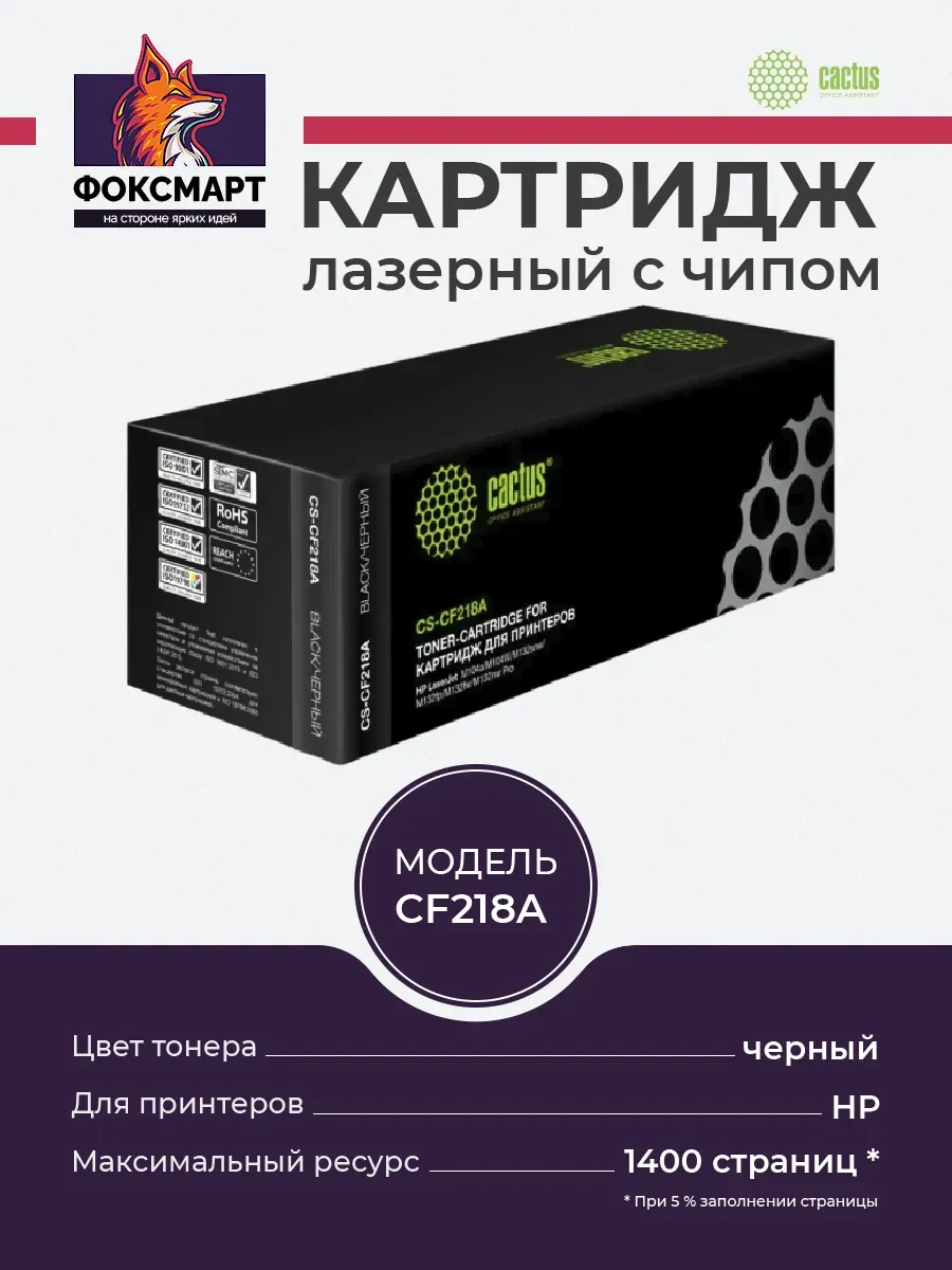 Картридж лазерный CS-CF218A - это качественный лазерный картридж от компании Cactus, который предназначен для использования в принтерах HP. При производстве совместимых расходных материалов используются только качественные комплектующие, обеспечивающие надежность продукции.Картридж позволяет печатать до 1400 страниц без потери качества. Он легко устанавливается и не требует дополнительных настроек. Цвет – черный.