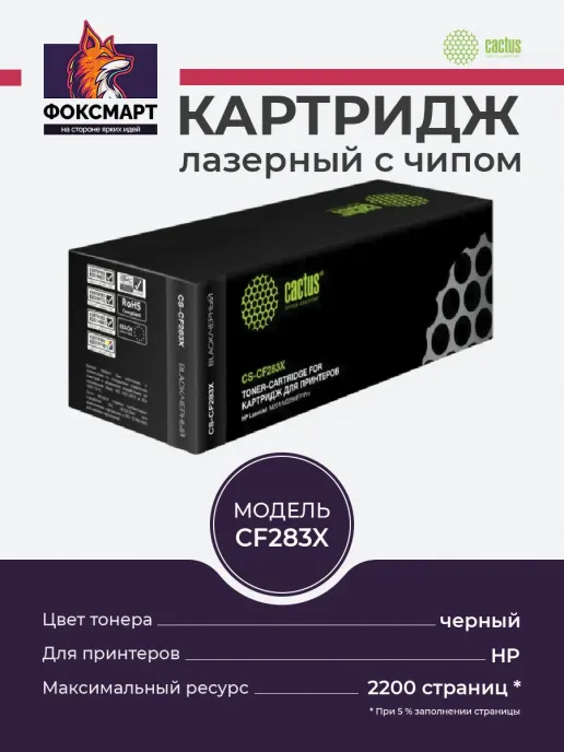 Лазерный картридж увеличенной емкости Cactus CS-CF283X. Предназначен для использования в принтерах HP LaserJet M200 series, M201dw Pro (CF456A), M201n Pro (CF455A), M202dw Pro (C6N21A), M202n Pro (C6N20A), M225 Pro MFP, M225dn Pro MFP (CF484A), M225dw Pro MFP (CF485A), M225rdn Pro MFP (CF486A). Страна производства - Китай. Цвет – черный. Используя картридж Cactus CS-CF283X у Вас будет возможность распечатать около 2200 информационных страниц (при 5% заполнении).