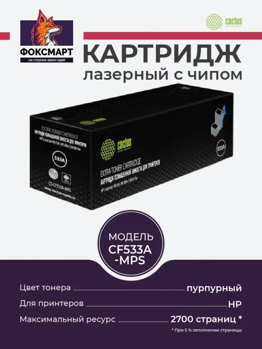 Совместимый лазерный картридж Cactus CF533A-MPS пурпурный предоставит Вам чёткие и насыщенные напечатанные документы. При печати отсутствуют видимые отличия от оригинального картриджа. В картриджах используются только качественные материалы, которые не навредят вашему печатному устройству. Ресурс полностью соответствует оригинальному. Картридж является оптимальным решением для Вас и для вашего оборудования. Легко заменяется на новый без дополнительных инструментов, за счёт чего не требует специальных навыков. Совместим с устройствами: HP Color LaserJet M154a Pro, M154nw Pro, M180n Pro, M181fw Pro.