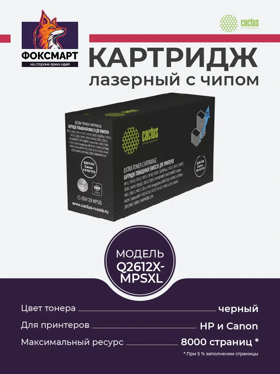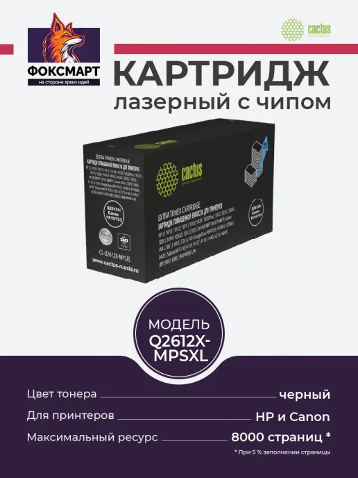 Картридж Cactus CS-Q2612X-MPSXL – это высококачественный совместимый картридж, разработанный для обеспечения четкой и надежной печати документов. Он идеально подходит для использования в популярных моделях принтеров HP LaserJet, таких как 1012, 1015, 1018, 1020, 1020Plus, 1022, 3015, 3020, 3030, 3050, 3050Z, 3052, 3055, MFP M1005 и MFP M1319, а также принтеров Canon FAX L100, L120, L140, L160, FAXPHONE L90, Canon imageClass 4350d, 4370dn, D420, MF4150, Canon LBP 2900, 3000, Canon Satera 4120, 4122, 4130, 4140, 4270, 4690 и Satera MF411. Этот картридж с черным тонером обеспечивает высокое качество печати, четкие тексты и насыщенные изображения. Лазерная технология печати гарантирует быструю и эффективную работу, а совместимость с широким спектром моделей принтеров делает его универсальным решением для дома и офиса. Cactus Q2612X MPSXL – это надежный и экономичный выбор для всех, кто ценит качество печати и удобство использования. Его установка проста и не требует специальных знаний, а ресурс картриджа позволя