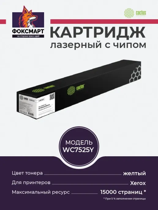 Совместимый лазерный картридж Cactus CS-WC7525Y предоставит Вам чёткие и насыщенные напечатанные документы. При печати отсутствуют видимые отличия от оригинального картриджа. В картриджах используются только качественные материалы, которые не навредят вашему печатному устройству. Ресурс полностью соответствует оригинальному. Картриджи Cactus – оптимальное решение для Вас и для вашего оборудования. Легко заменяется на новый без дополнительных инструментов, за счёт чего не требует специальных навыков.