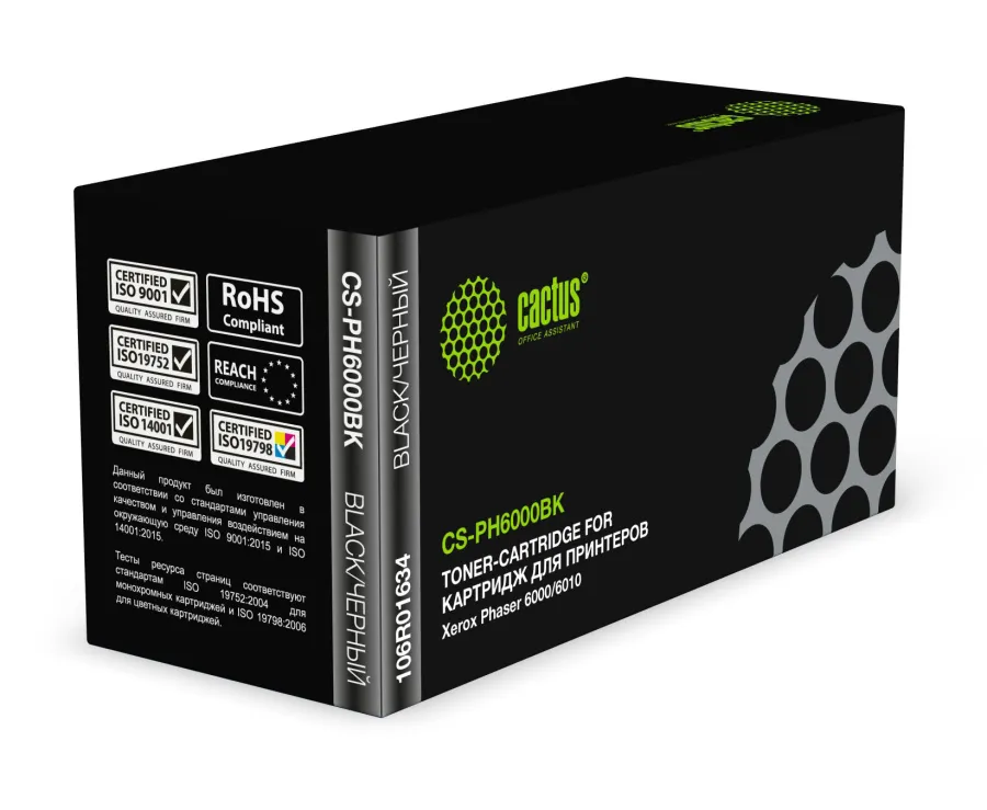 Картридж CACTUS CS-PH6000BK 106R01634 - это надежный и экономичный выбор для печати документов высокого качества. Этот совместимый лазерный картридж, разработанный для принтеров Xerox Phaser 6000, Phaser 6010N, WorkCentre 6015, Phaser 6010 и Phaser 6000B, обеспечивает четкий и насыщенный черный цвет на протяжении 2000 страниц. Благодаря простоте установки и эксплуатации, картридж CACTUS CS-PH6000BK станет незаменимым помощником в офисе или дома, гарантируя бесперебойную работу вашего принтера. Он обеспечит четкость и профессиональный вид ваших документов, от отчетов и презентаций до важных писем и контрактов. С картриджем CACTUS CS-PH6000BK вы можете быть уверены в качестве печати и экономии средств.