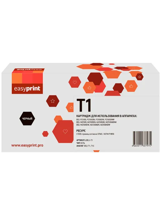 T1 Картридж EasyPrint LDELI-T1 представляет собой качественный и надёжный расходный материал для лазерных принтеров DELI. Он предназначен для использования с моделями P2500 и M2500, имеет ресурс 3500 страниц и обеспечивает высокое качество печати.Установка и замена картриджа не требует специальных навыков или инструментов.