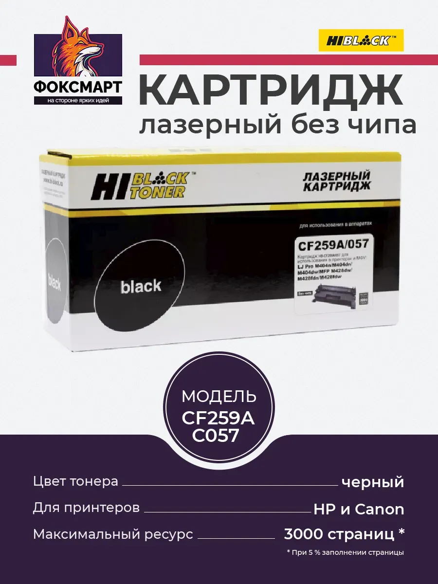 Картридж Hi-Black (CF259A, 057) для лазерных принтеров и МФУ HP. Ресурс составляет 3000 копий при 5% заполнении листа (данный показатель может изменяться в виду особенностей тех или иных настроек, выставляемых при печати). Cовместим с различными моделями лазерных принтеров. Этот картридж идеально подойдет для тех, кому необходима профессиональная и стабильная печать текстовых документов и графических изображений. Простота установки и обслуживания картриджа делают его удобным для использования как в офисе, так и дома. Совместим с принтерами: HP LaserJet Pro M304, M404n, MFP M428dw, Canon i-SENSYS MF-443, MF-445.
