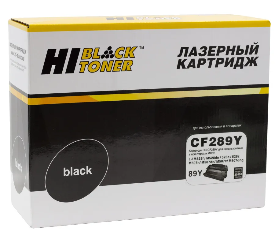 Картридж Hi-Black (CF289Y) ультра повышенной ёмкости для лазерных принтеров и МФУ HP. Ресурс составляет 20000 копий при 5% заполнении листа (данный показатель может изменяться в виду особенностей тех или иных настроек, выставляемых при печати). Cовместим с различными моделями лазерных принтеров. Этот картридж идеально подойдет для тех, кому необходима профессиональная и стабильная печать текстовых документов и графических изображений. Простота установки и обслуживания картриджа делают его удобным для использования как в офисе, так и дома. Совместим с принтерами: HP LaserJet Enterprise M507dn, M507x, Flow M528, M528dn, M528z.