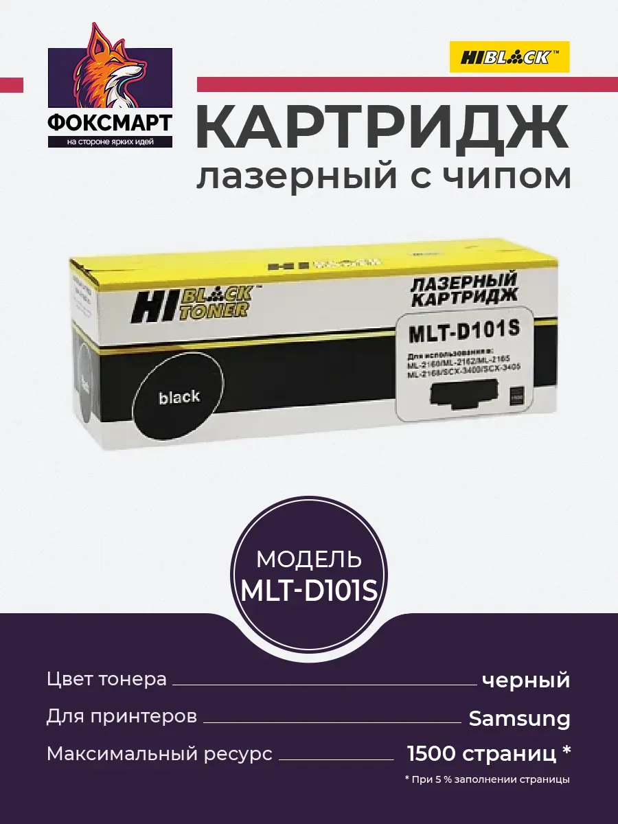 Картридж Hi-Black (MLT-D101S) для лазерных принтеров и МФУ Samsung. Ресурс составляет 1500 копий при 5% заполнении листа (данный показатель может изменяться в виду особенностей тех или иных настроек, выставляемых при печати). Cовместим с различными моделями лазерных принтеров. Этот картридж идеально подойдет для тех, кому необходима профессиональная и стабильная печать текстовых документов и графических изображений. Простота установки и обслуживания картриджа делают его удобным для использования как в офисе, так и дома. Совместим с принтерами: Samsung ML-2160, ML-2161, ML-2162, ML-2163, ML-2165, ML-2166W, ML-2168, SCX-3400, SCX-3401, SCX-3401FH, SCX-3405, SCX-3406W, SCX-3406HW, SF760, SF761, SF761P.
