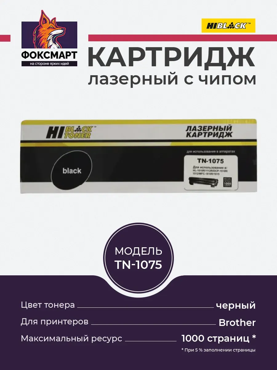 Тонер-картридж Hi-Black (TN-1075) для лазерных принтеров и МФУ Brother. Ресурс составляет 1000 копий при 5% заполнении листа (данный показатель может изменяться в виду особенностей тех или иных настроек, выставляемых при печати). Cовместим с различными моделями лазерных принтеров. Этот картридж идеально подойдет для тех, кому необходима профессиональная и стабильная печать текстовых документов и графических изображений. Простота установки и обслуживания картриджа делают его удобным для использования как в офисе, так и дома. Совместим с принтерами: Brother HL-1110R, HL-1111, HL-1112, HL-1118, DCP-1510R, DCP-1511, DCP-1512R, DCP-1518, MFC-1810R, MFC-1813, MFC-1815, MFC-1818, MFC-1612.