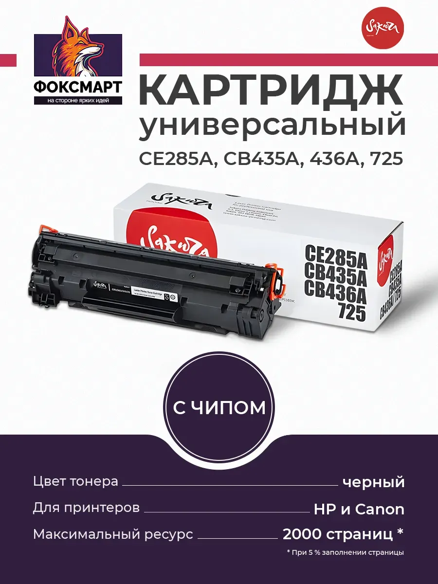 Картридж лазерный Sakura CE285A/CB435A/436A/725 . Совместим с принтерами HP, Canon P1005, P1006, P1500, P1505, 1522, M1120, M1120N, M1522N, M1522F, P1505N, P1102, P1102W, M1132, Canon LBP6000, 6018, 6020, 6030, MF3010. Ресурс картриджа составляет до 2000 страниц, что позволяет существенно сэкономить на замене расходных материалов.