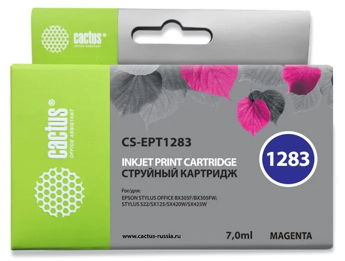Картридж струйный Cactus CS-EPT1283 T1283 пурпурный предназначен для струйных принтеров и МФУ. Насыщенный цвет чернил обеспечивает высокое качество печати. Картридж легко устанавливается в оборудование. Картридж оснащён чипом, который обеспечивает корректное взаимодействие с принтером и контроль расхода чернил. Заправлен высококачественными пигментными чернилами, которые гарантируют стабильную и яркую печать. Совместим с устройствами: Epson Stylus OFFiCE BX305, BX305F, BX305F, Epson Stylus S125, S22, SX125, SX130, SX420, SX420w, SX425, SX425w, SX438, SX438W.