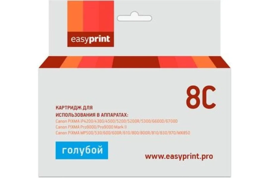 Картридж EasyPrint IC-CLI8C для Canon PIXMA iP3300/3500/4200/4200x/4300/4500/4500x/5200/5200R/5300/6600D/6700D/MP500/510/520/520x/530/600/600R/610/800/800R/810/830/970/MX700/850/iX4000/5000/Pro9000/Pro9000 Mark II (490 стр.), голубой, с чипом