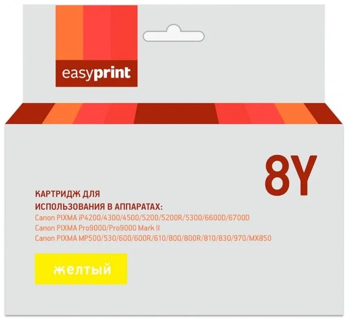 Картридж EasyPrint IC-CLI8Y для Canon PIXMA iP3300/3500/4200/4200x/4300/4500/4500x/5200/5200R/5300/6600D/6700D/MP500/510/520/520x/530/600/600R/610/800/800R/810/830/970/MX700/850/iX4000/5000/Pro9000/Pro9000 Mark II (490 стр.), желтый, с чипом