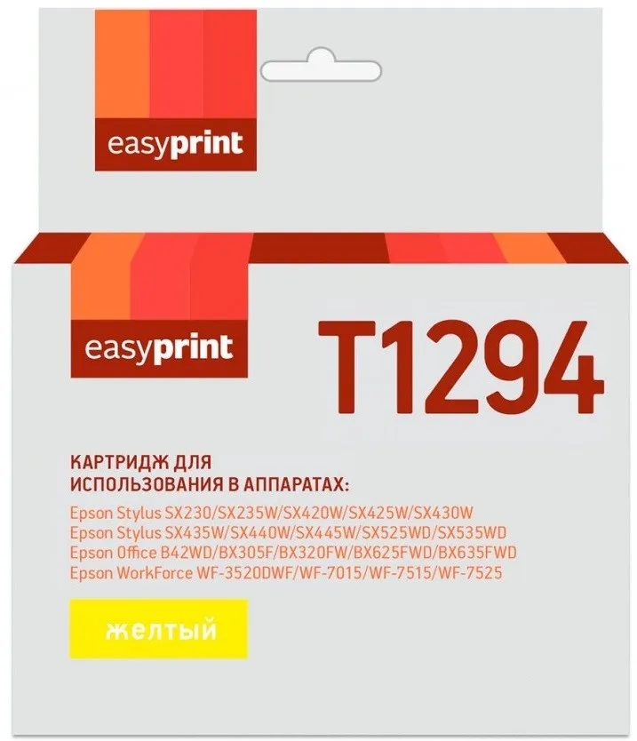 Картридж EasyPrint IE-T1294 для Epson Идеально подходит для тех, кому нужна профессиональная и стабильная печать различных текстовых документов, графиков, таблиц и других материалов. Простая установка, замена и обслуживание картриджа делают его использование удобным и быстрым, а прочная конструкция гарантирует долгий срок службы и стабильную работу вашего принтера.