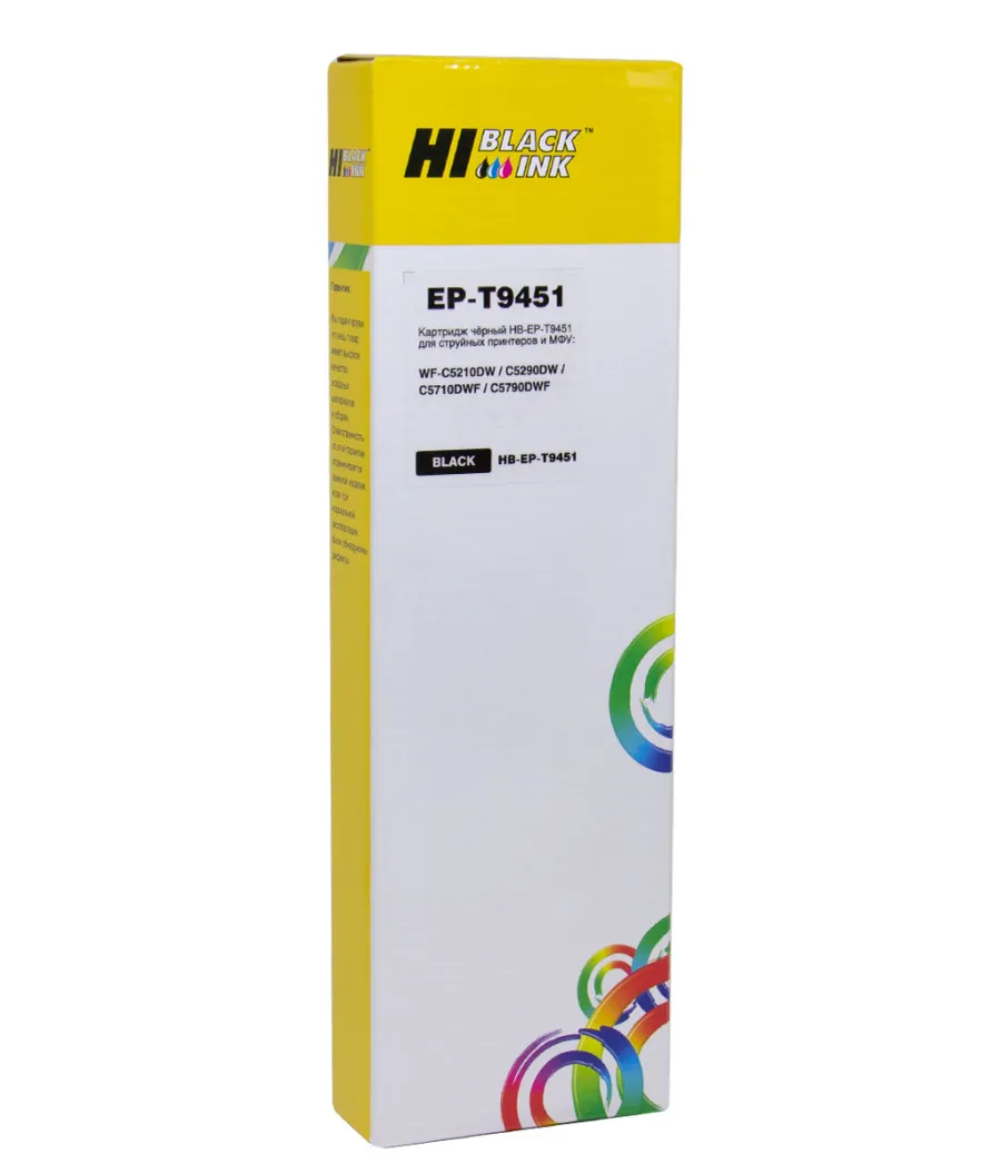 Струйный картридж Hi-Black (EPT9451) для цветных принтеров и МФУ Epson. Ресурс составляет 5000 копий при 5% заполнении листа (данный показатель может изменяться в виду особенностей тех или иных настроек, выставляемых при печати). Совместимость с печатающими устройствами: Epson WorkForce Pro WF-C5290DW, Epson WorkForce Pro WF-C5790DWF.