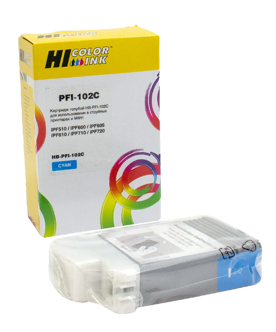 Струйный картридж Hi-Black (HB-PFI-102C) для цветных принтеров и МФУ Canon. Совместимость с печатающими устройствами: Canon IPF510, Canon iPF600, Canon iPF605, Canon iPF610, Canon iPF710, Canon IPF720. Объем 130 мл.
