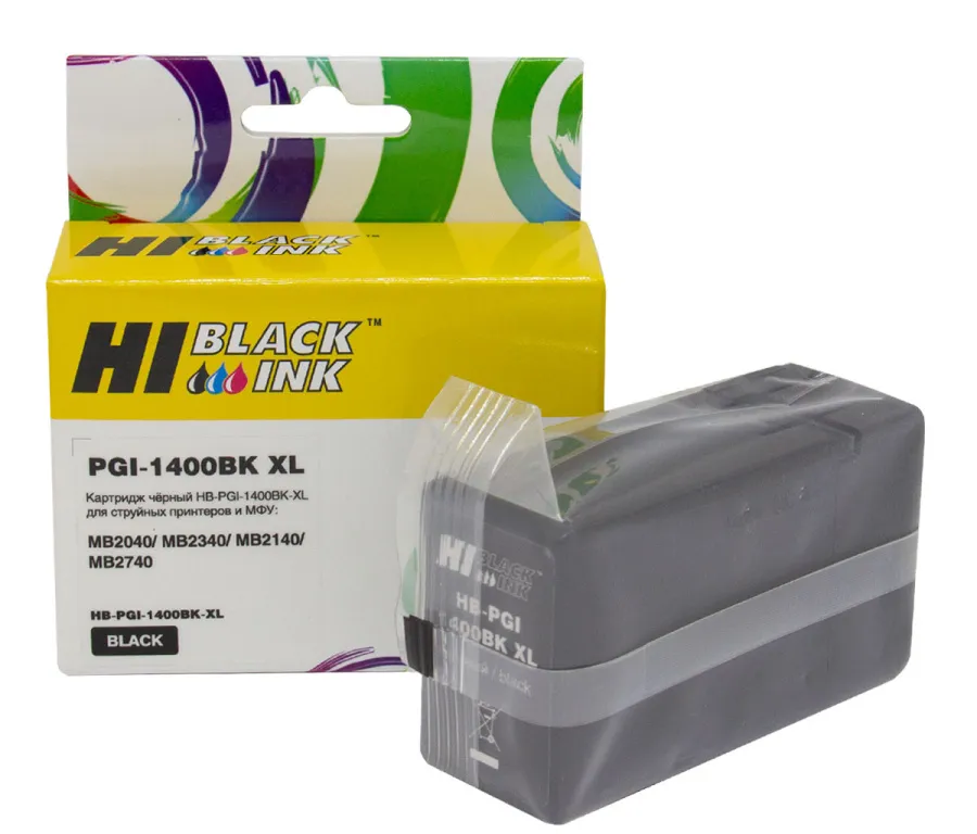 Струйный картридж Hi-Black (PGI-1400XLBK) повышенной емкости для цветных принтеров и МФУ Canon. Ресурс составляет 1200 копий при 5% заполнении листа (данный показатель может изменяться в виду особенностей тех или иных настроек, выставляемых при печати). Совместимость с печатающими устройствами: Canon MAXIFY MB2040, MB2140, MB2340, MB2740, MB2050, MB2350.