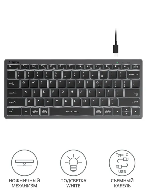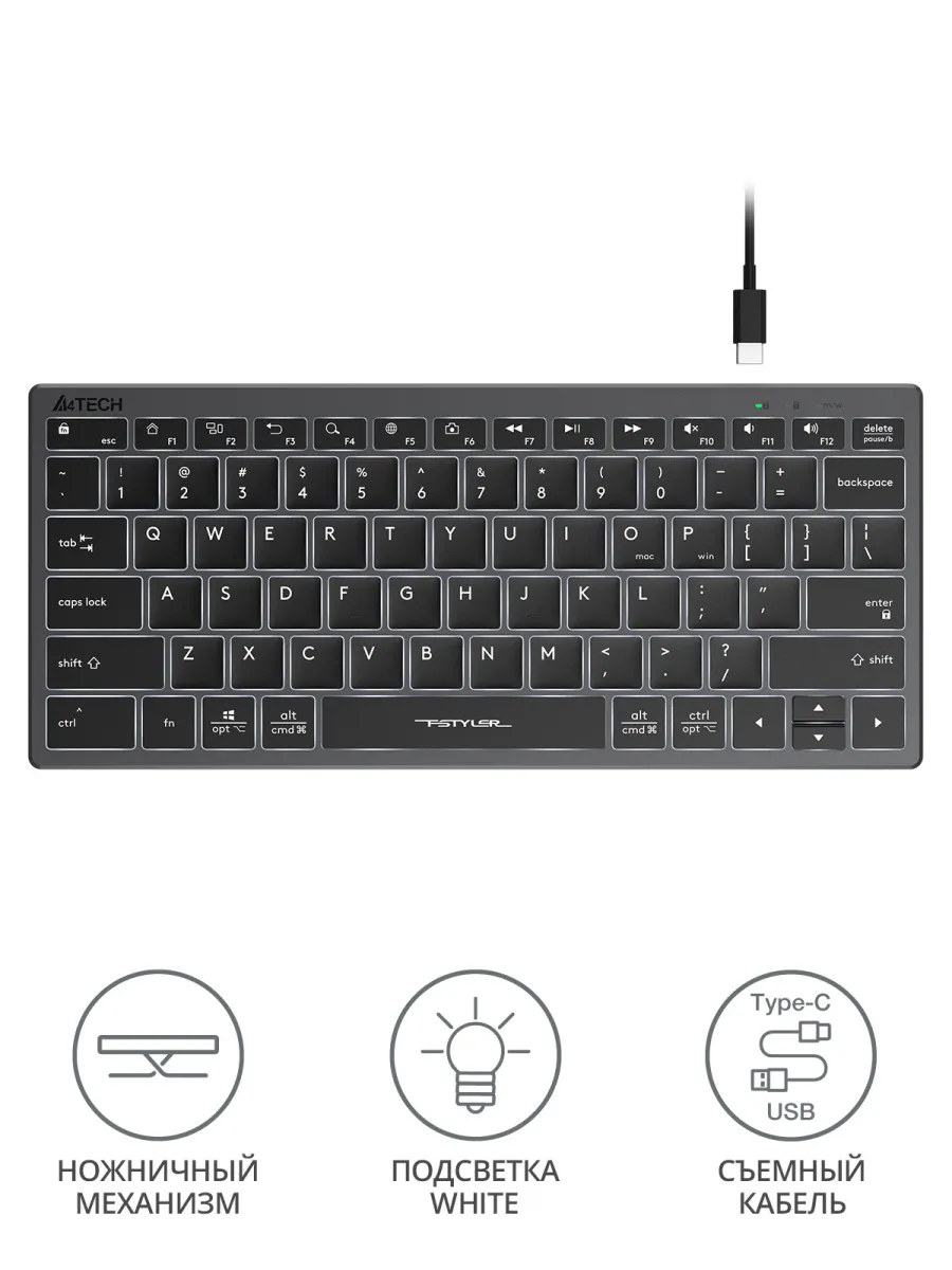 Клавиатура A4Tech Fstyler FX61 серый USB slim LED (FX61 GREY). Компактный размер. Ножничный тип нажатия клавиш. Горячие мультимедийные клавиши: 12 Fn. Благодаря съемному кабелю с разъемом USB Type-C транспортировка клавиатуры станет еще удобнее. Ультратонкая форма кейкапов для быстрого и удобного набора текста.