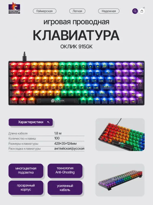 Механическая игровая клавиатура Оклик 915GK подчеркнет захватывающую атмосферу во время игры и поможет с комфортом достигать впечатляющих результатов в различных тайтлах. Модель выполнена в черном цвете и оснащена прозрачными кейкапами, сквозь которые видна многоцветная подсветка, они обладают плавным негромким ходом без тактильного отклика и щелчка. Прозрачный корпус придает устройству неповторимый геймерский дизайн. Игровая клавиатура имеет компактный форм-фактор и оснащена 100 клавишами. Девайс прекрасно подойдет для динамичных онлайн-шутеров, гонок и файтингов, требующих быстрой реакции и частых нажатий на кнопки. Клавиатура Оклик 915GK поддерживает технологию Anti-Ghosting. C ней можно одновременно зажимать любое количество клавиш, не опасаясь «фантомных нажатий».